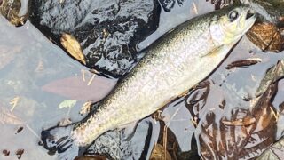 釣りパパ No.270 滋賀県甲賀市の田村川(土山漁協管内)で渓流釣り解禁2日目! 2025.12.14 釣行。 天候 雨のち晴れ。 釣り時間 9:30〜14:00。 《渓流釣り仕掛け》 渓流竿4.5㍍。 天上糸0.8号。 道糸0.6号。 ハリス0.4号。 目印オレンジ、グリーン、ピンク、グリーンの4個。 オモリB〜2B。 ハリ6号。 エサはイクラとブドウムシ。 2025.12.31 釣りパパ