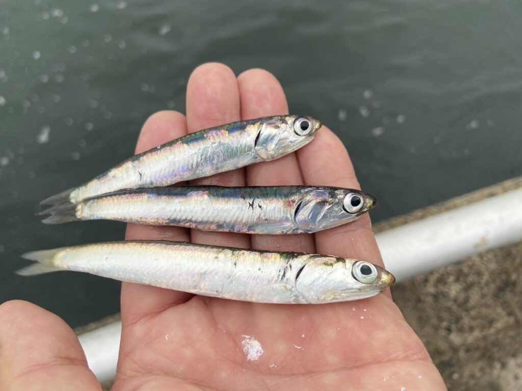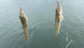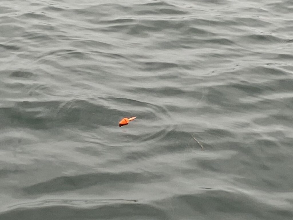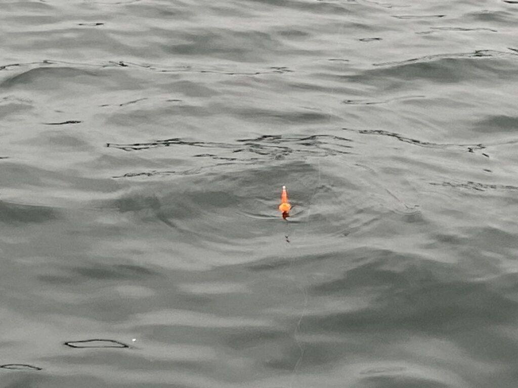 ウキが馴染んだら軽くシャクってアミエビを出すとウキが上下して波紋が広がりウキが寝て食い上げアタリです。