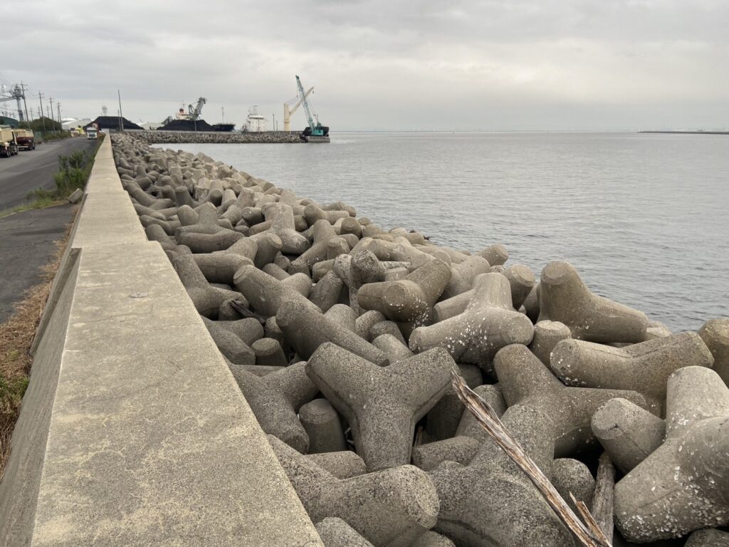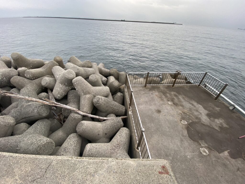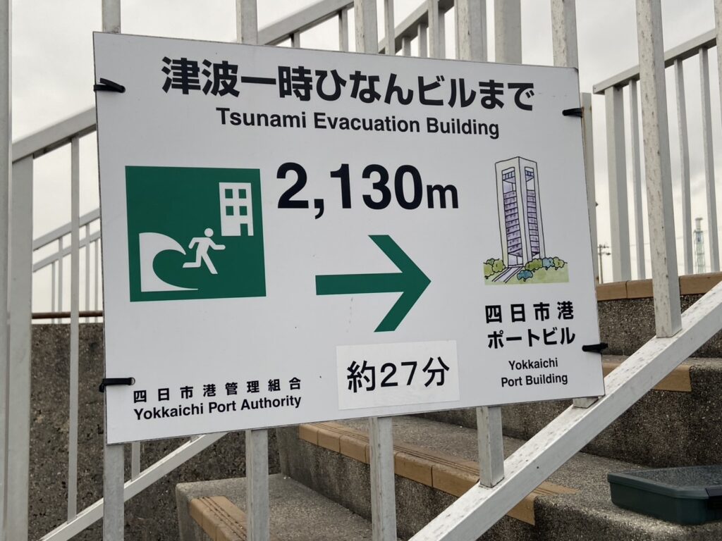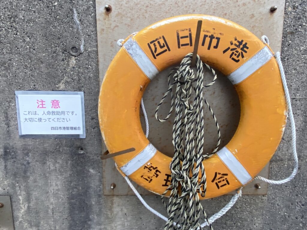 釣りテラスには人命救助の浮き輪や津波の時の避難ビルまでの距離が表示されています。
