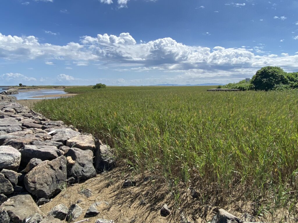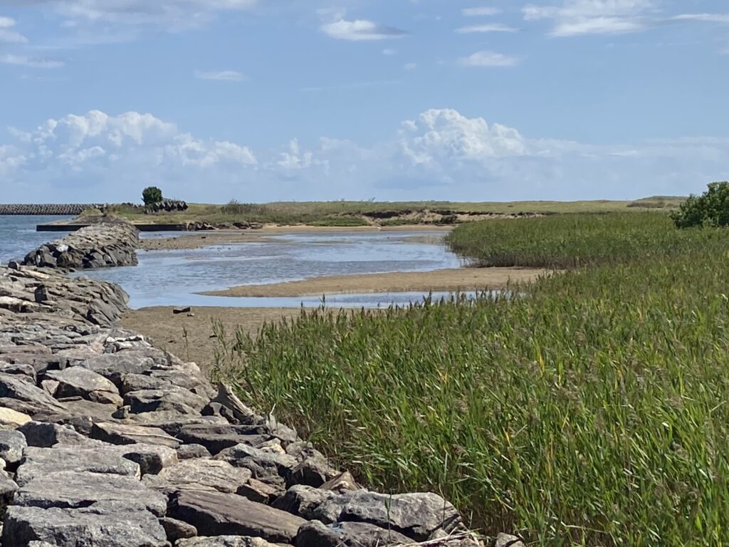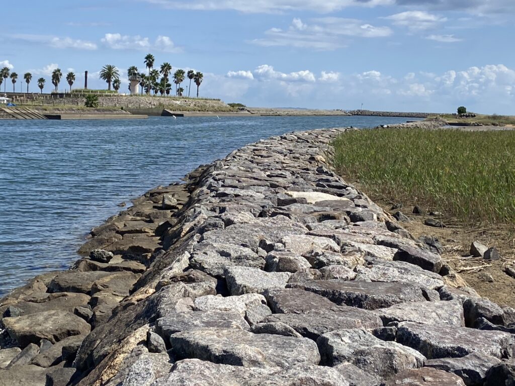 下流側には石積み堤が伸びていて葦原や干潟が広がっています。