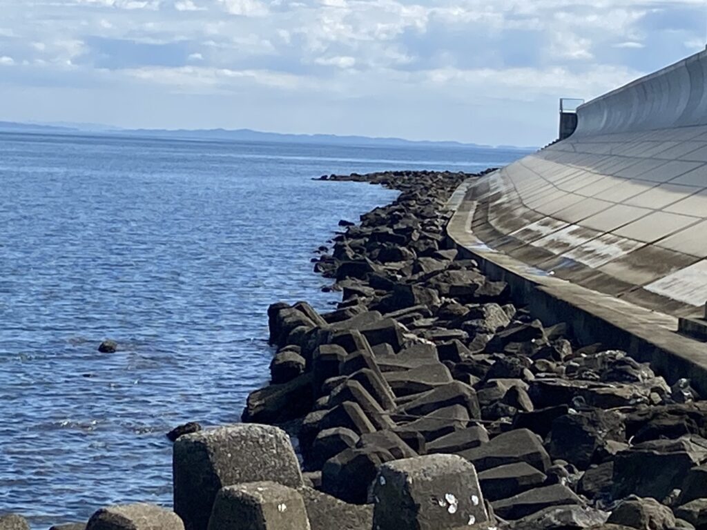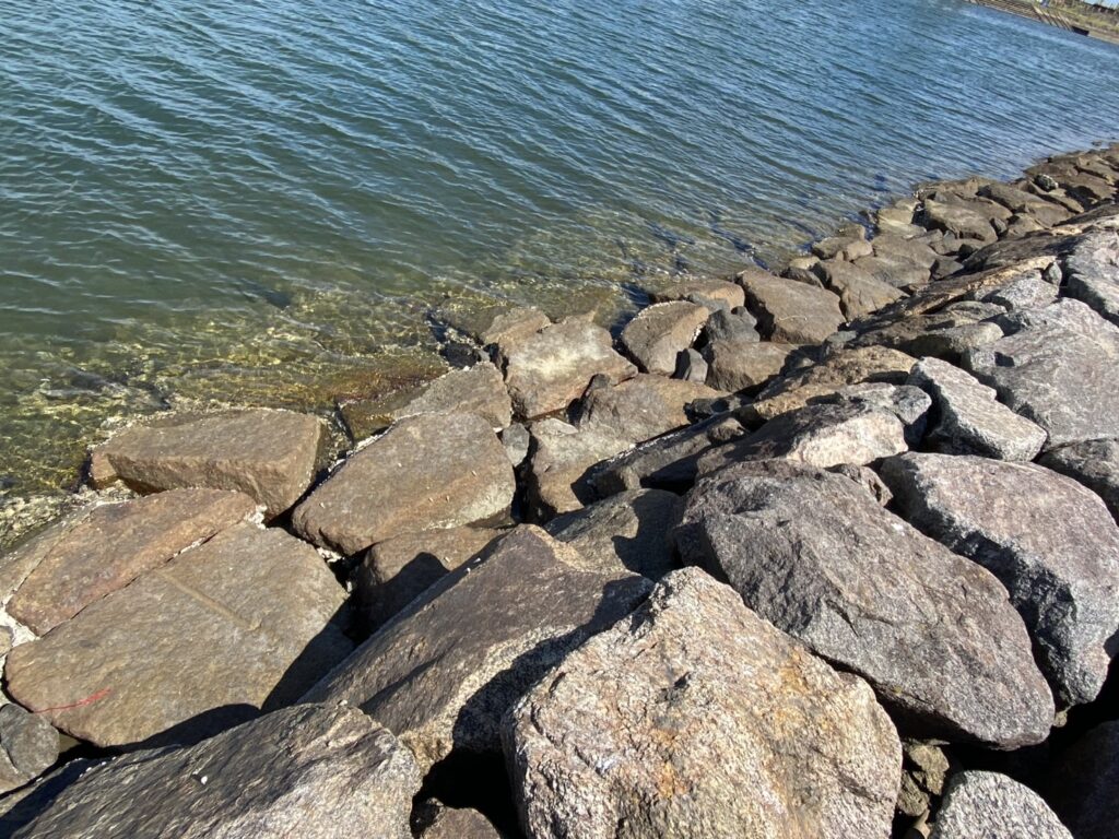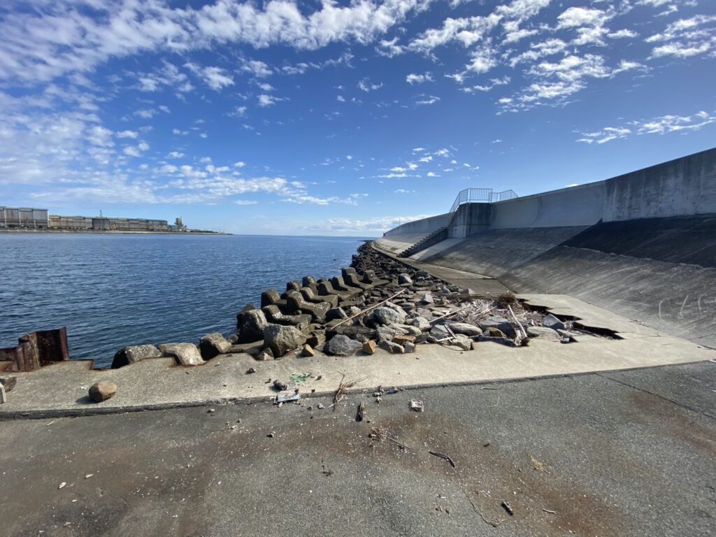 護岸道路の階段下はゴロゴロの岩や消波ブロックが並んでいます。