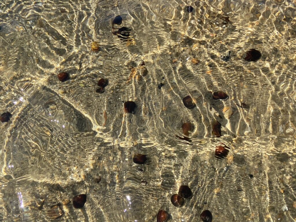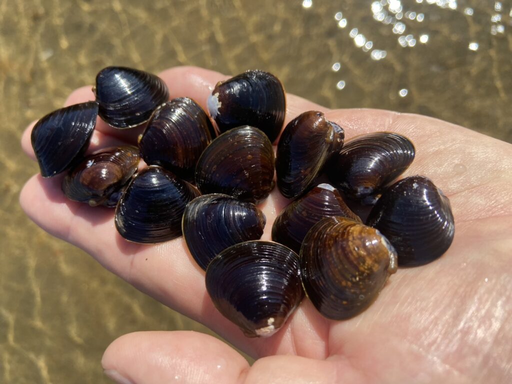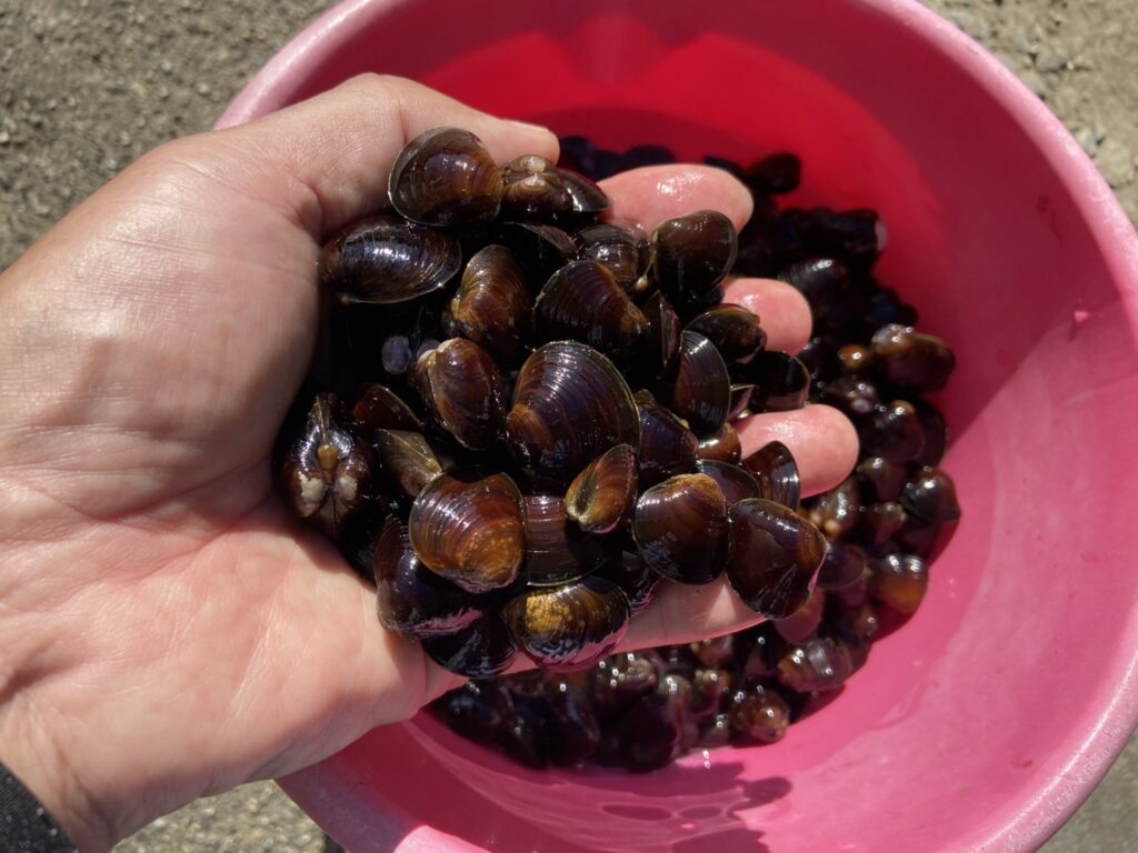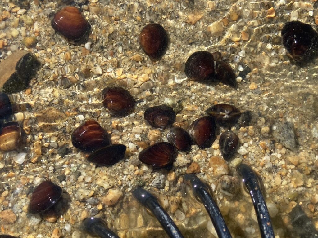 流れの浅瀬をホリホリするとちょっぴり大きいシジミが交ざってザクザク出てきました。