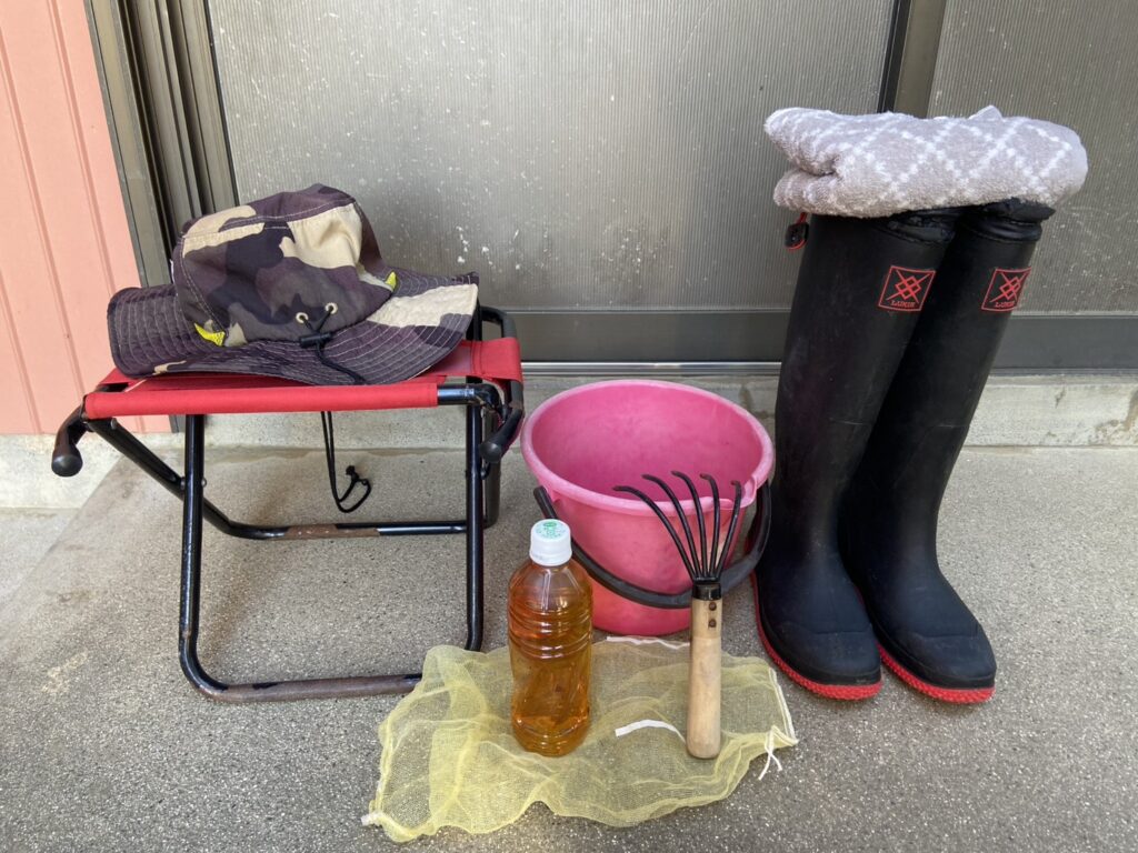 熊手、バケツ、網袋、長靴、帽子、タオル、飲み物、パイプ椅子など。