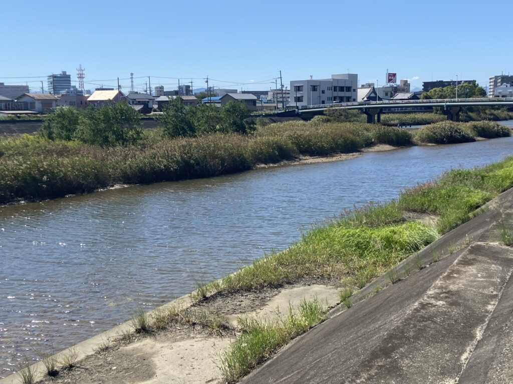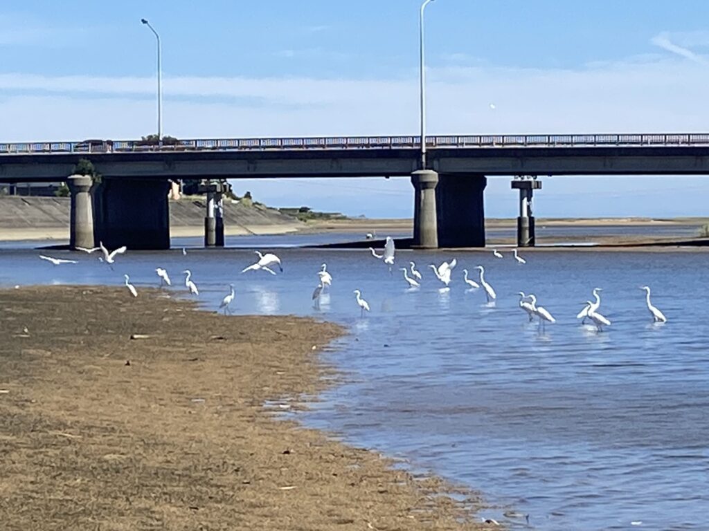 下流側の橋の近くにはシラサギがエサを求めて群がっています。