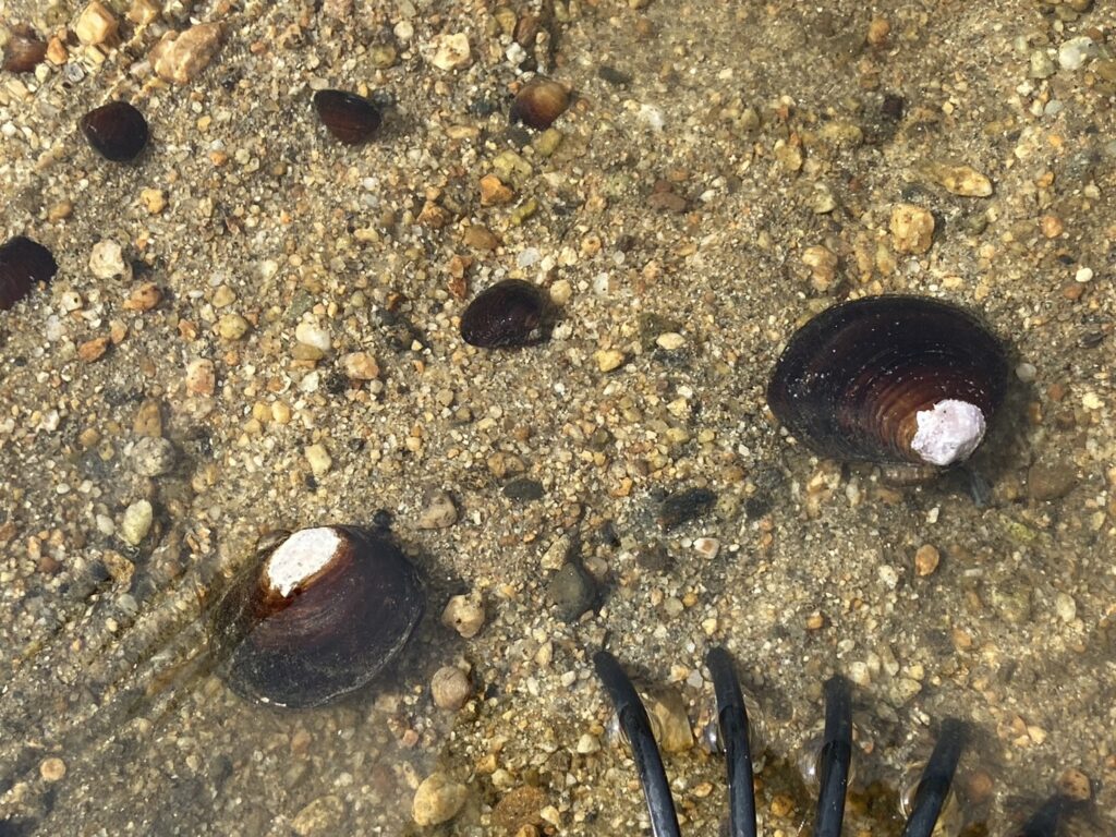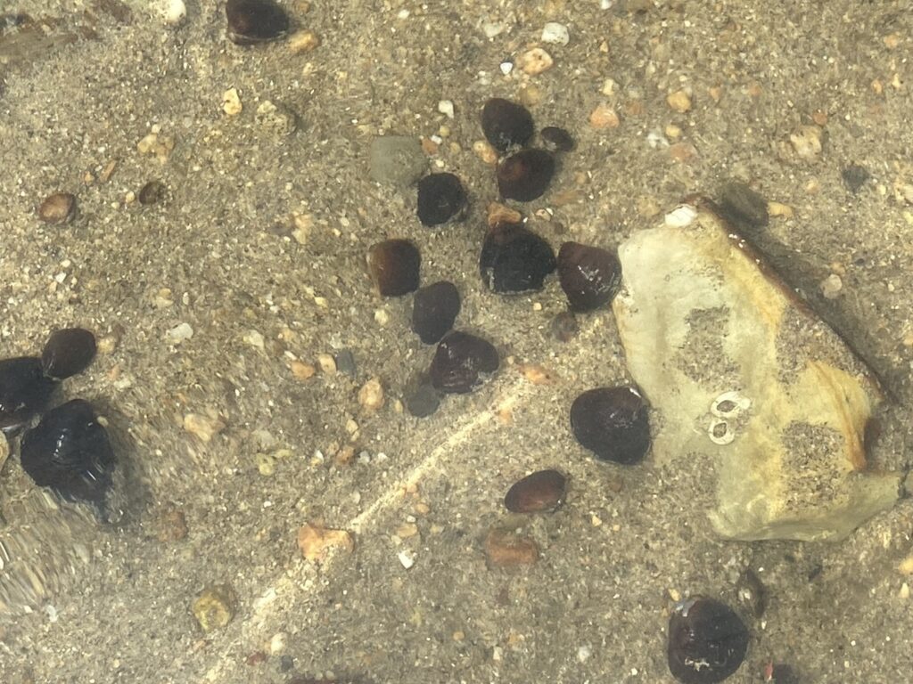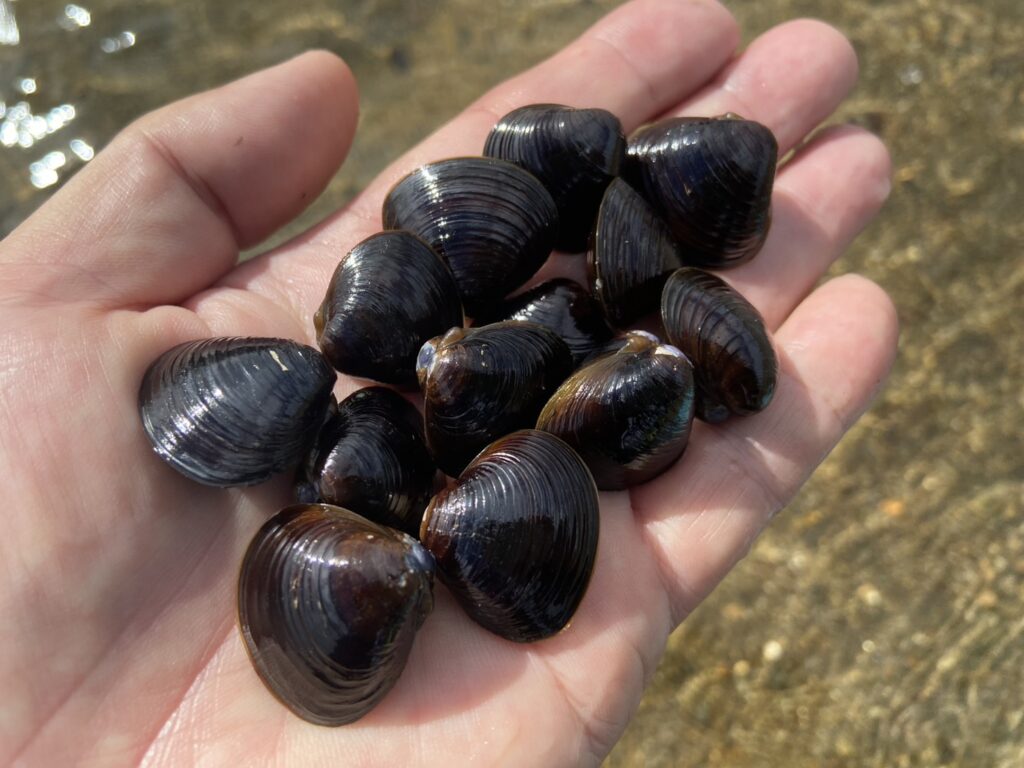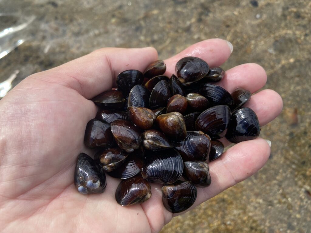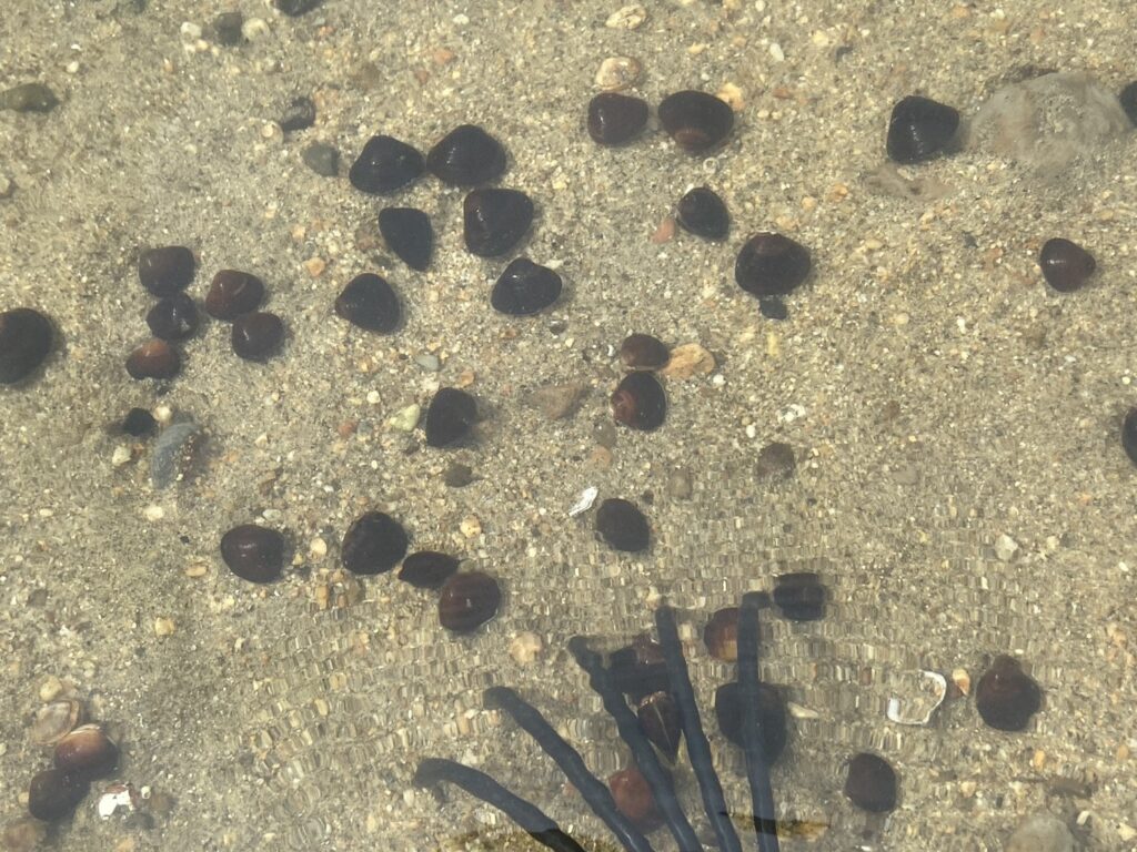 浅瀬には小粒なシジミがいっぱい残っています。