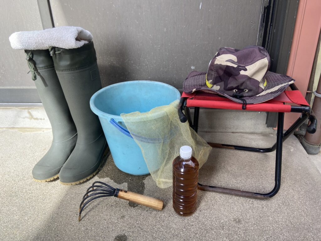 熊手、バケツ、網袋、長靴、帽子、タオル、飲み物、パイプ椅子など。