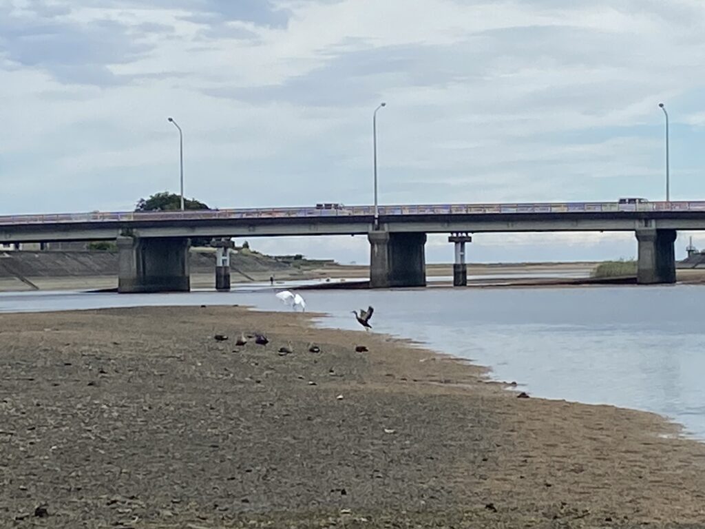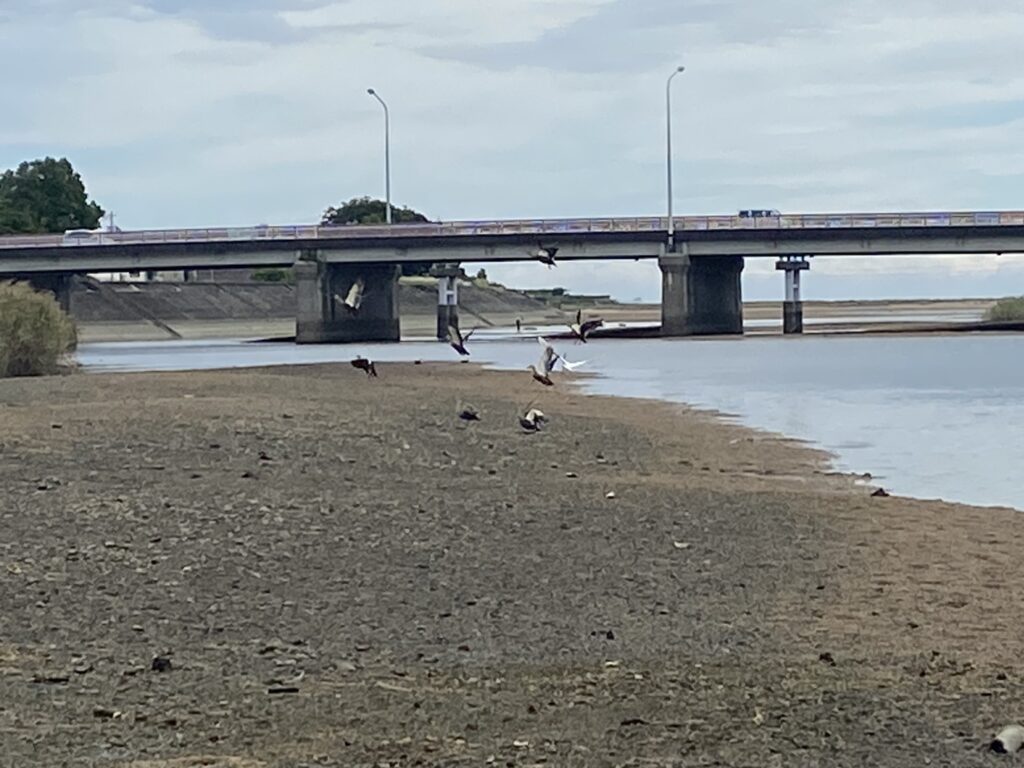下流側の川原にはカモやシラサギが休んでいました。