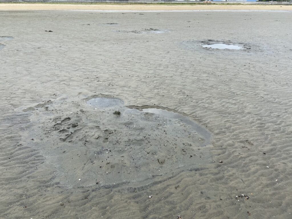 潮が引いた海岸にはホリホリした大小の穴が並んでいます。