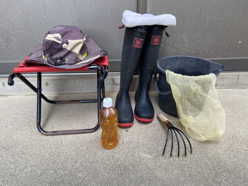 熊手、バケツ、網袋、長靴、帽子、飲み物、タオル、パイプ椅子など。