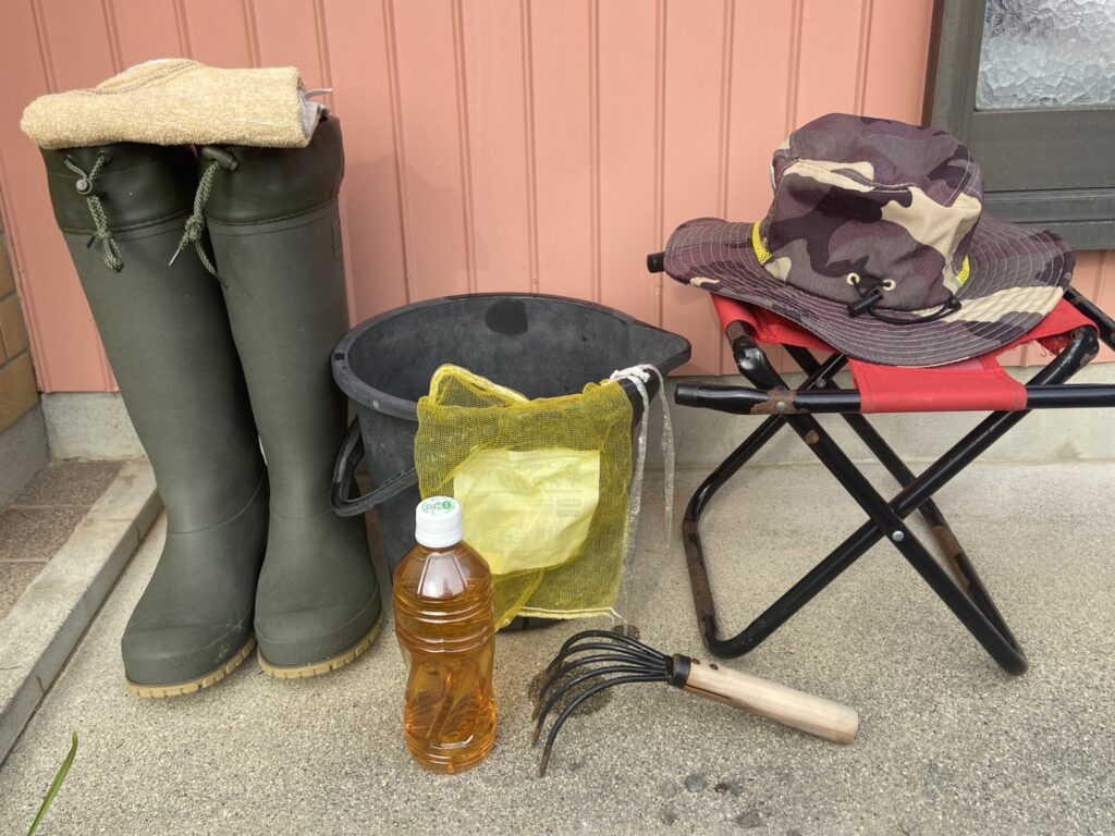 熊手、バケツ、網袋、長靴、帽子、飲み物、タオル、パイプ椅子など。