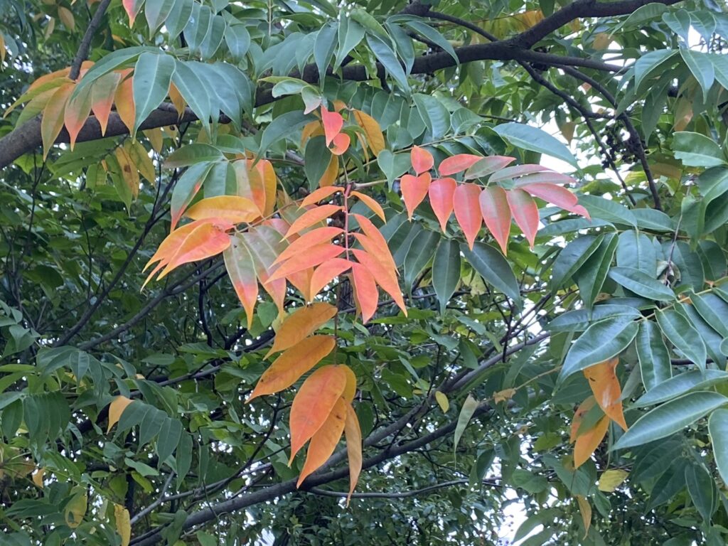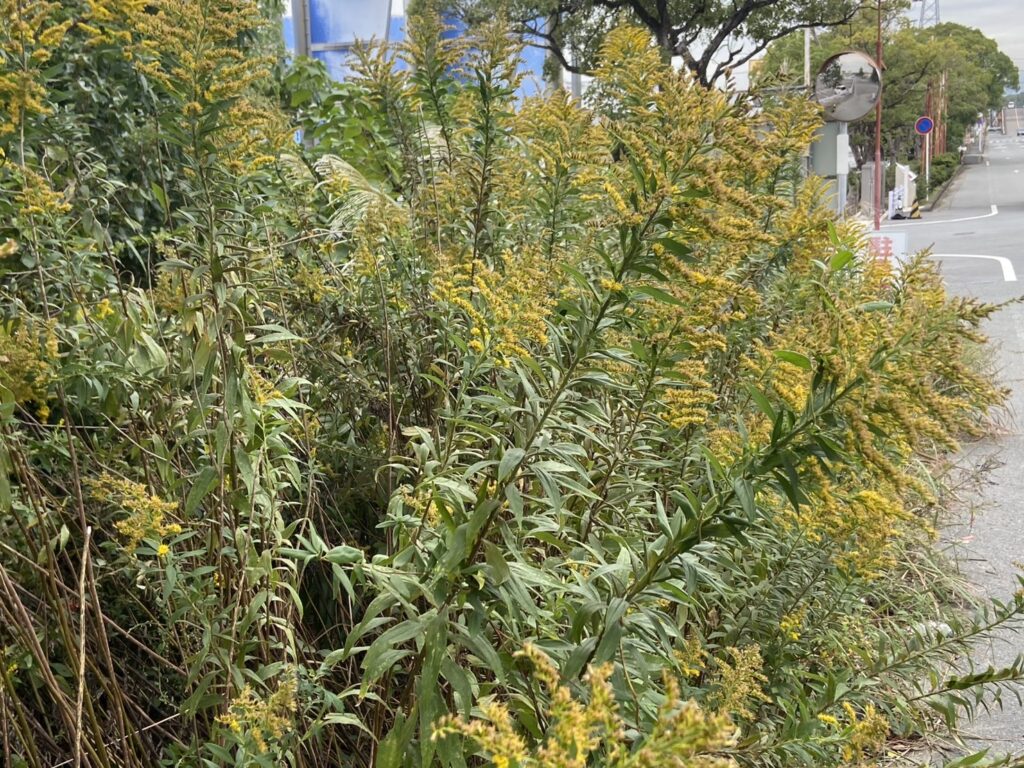 護岸道路近くの木々は色付いてセイタカアワダチソウも黄色い花をつけていました。