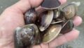 手のひらに乗ってるのは左からアサリ、シオフキガイ、ハマグリです。