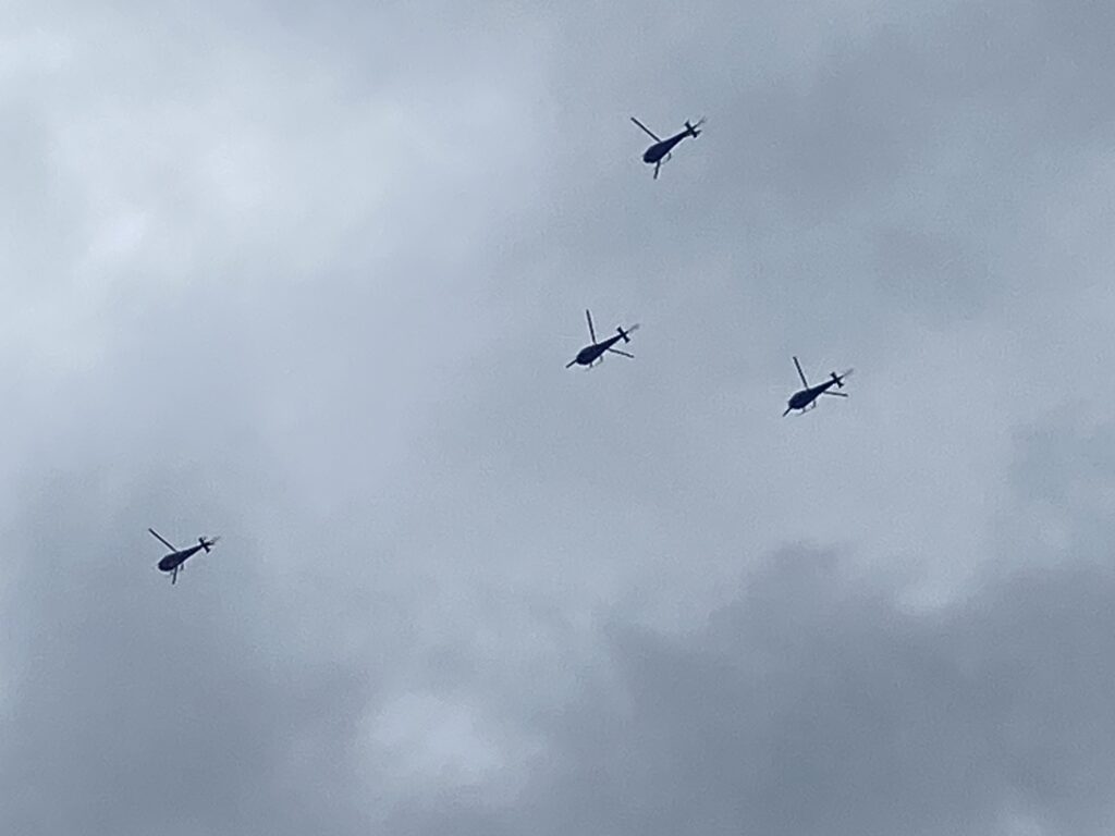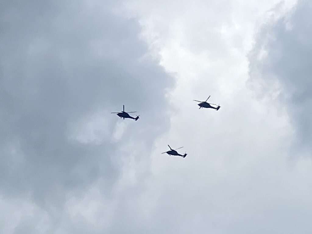 19機のヘルコプターが上空を旋回して飛んで行きました。