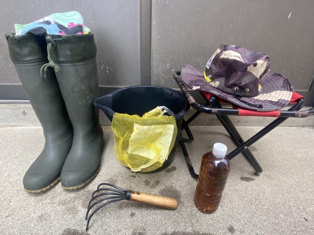 熊手、バケツ、網袋、長靴、帽子、飲み物、タオル、パイプ椅子など。