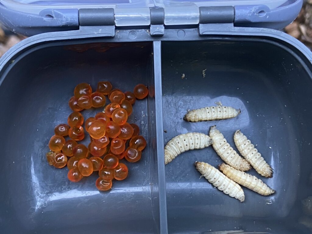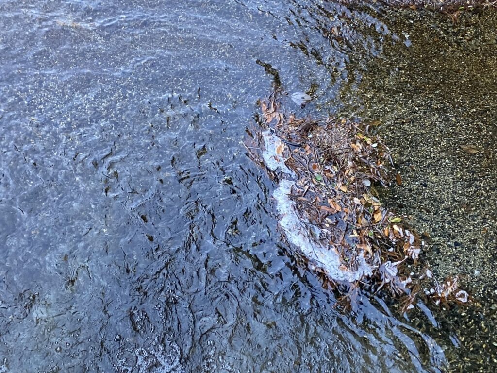 イクラのエサで水流が流れ落ちてできる白泡へ投入しました。白泡から仕掛けが流れ出ると目印が震えてニジマスがヒット。