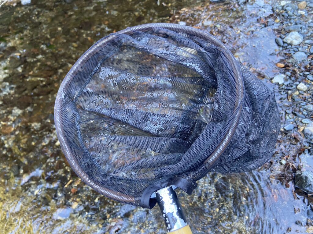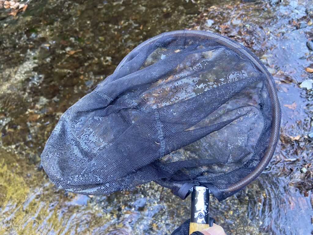 寒くて水で濡れた玉網がバリバリに凍ってしまいます。