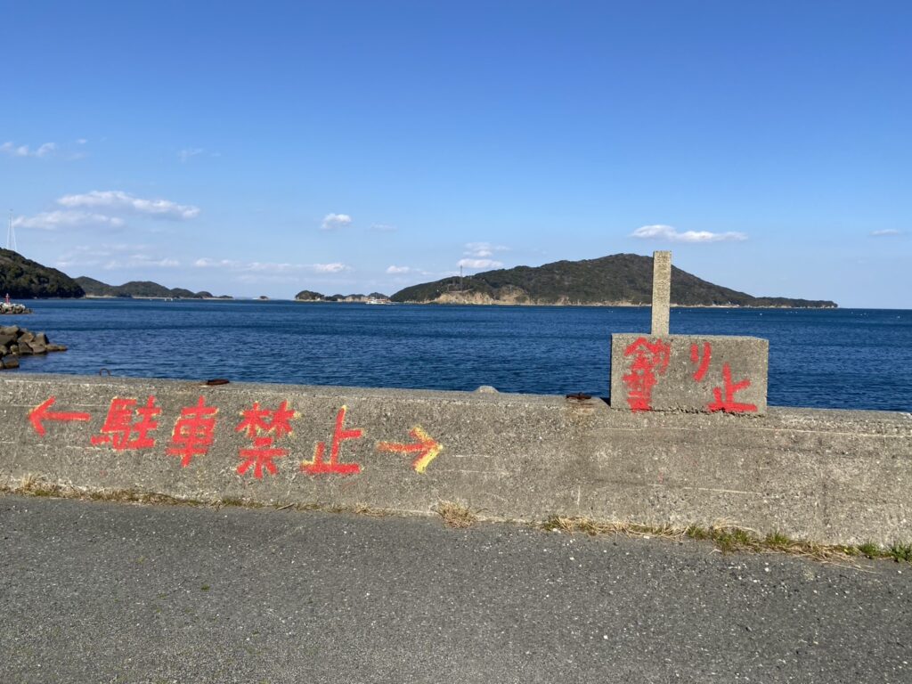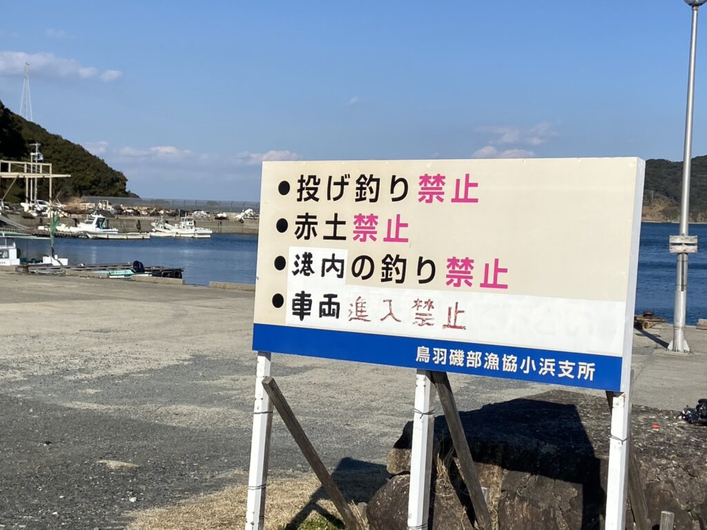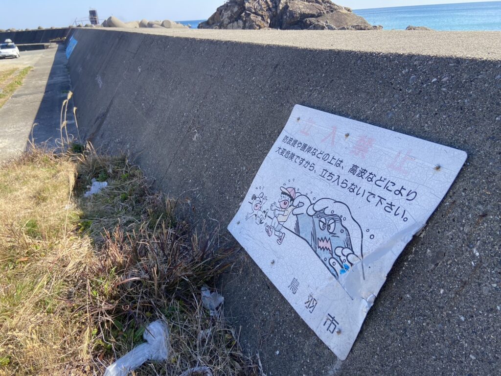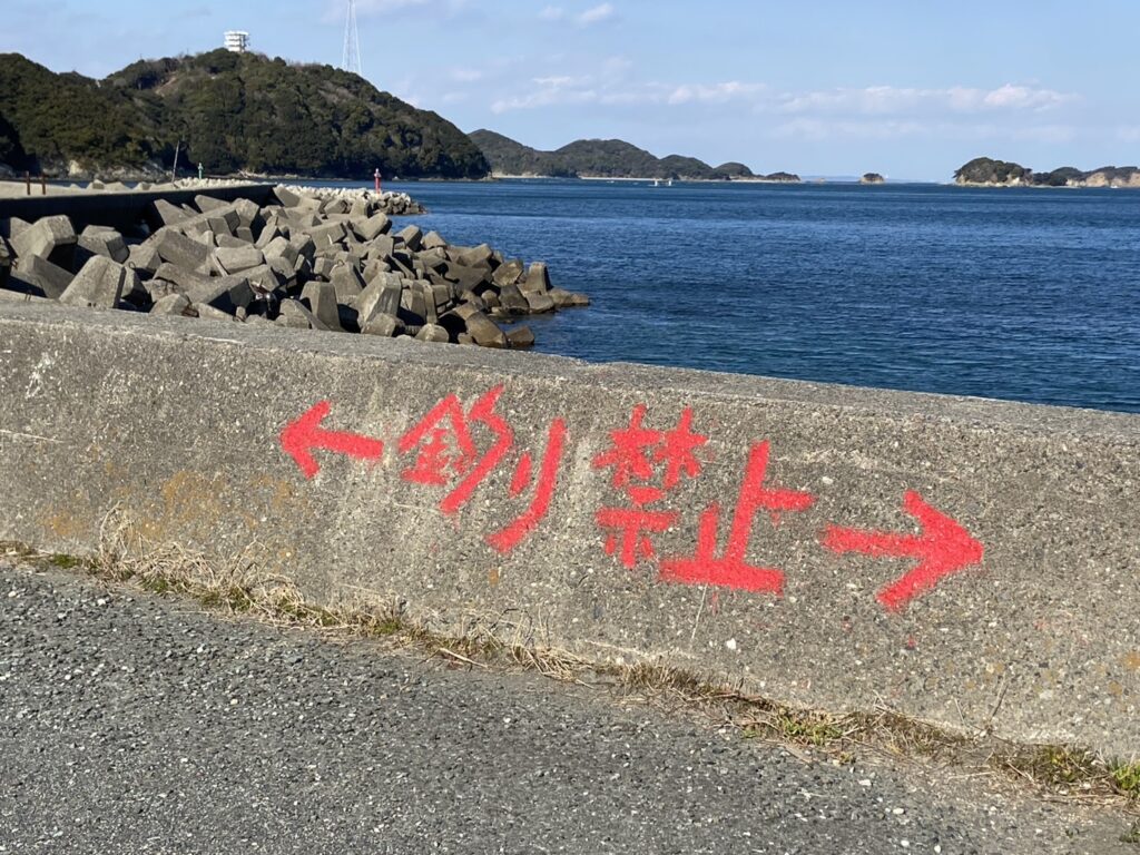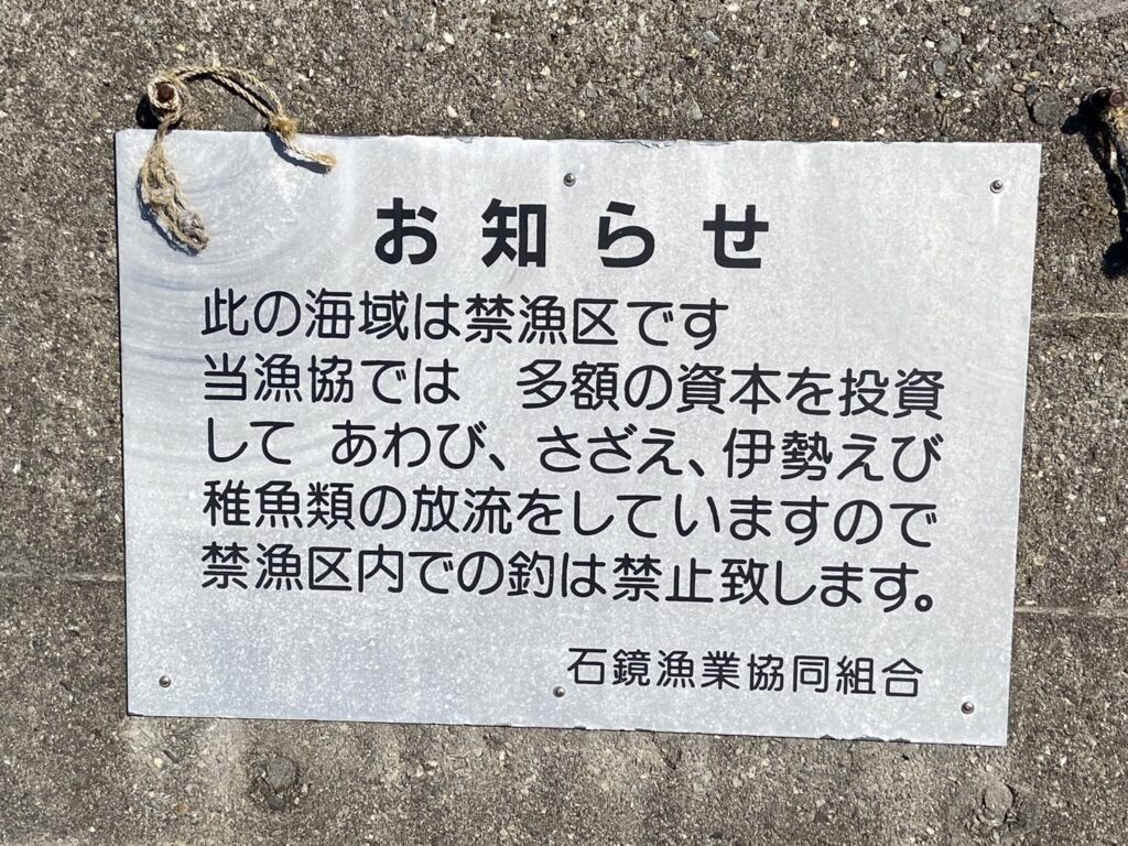 石鏡漁港に到着すると堤防には釣り禁止のお知らせが表示されていました。