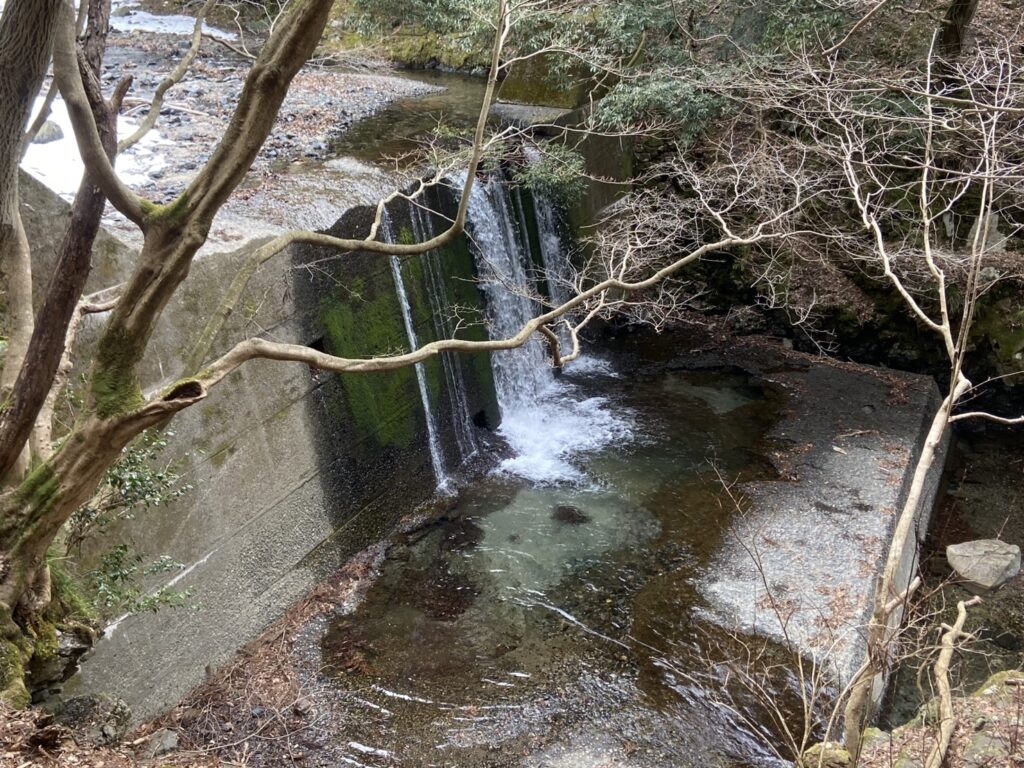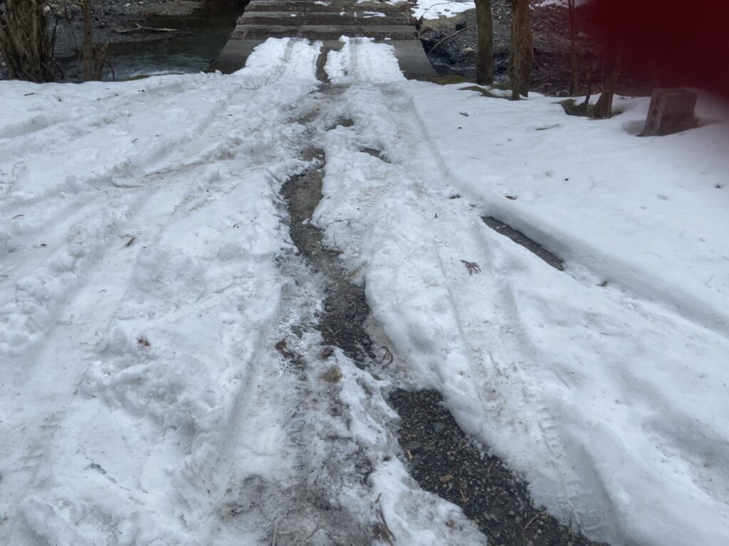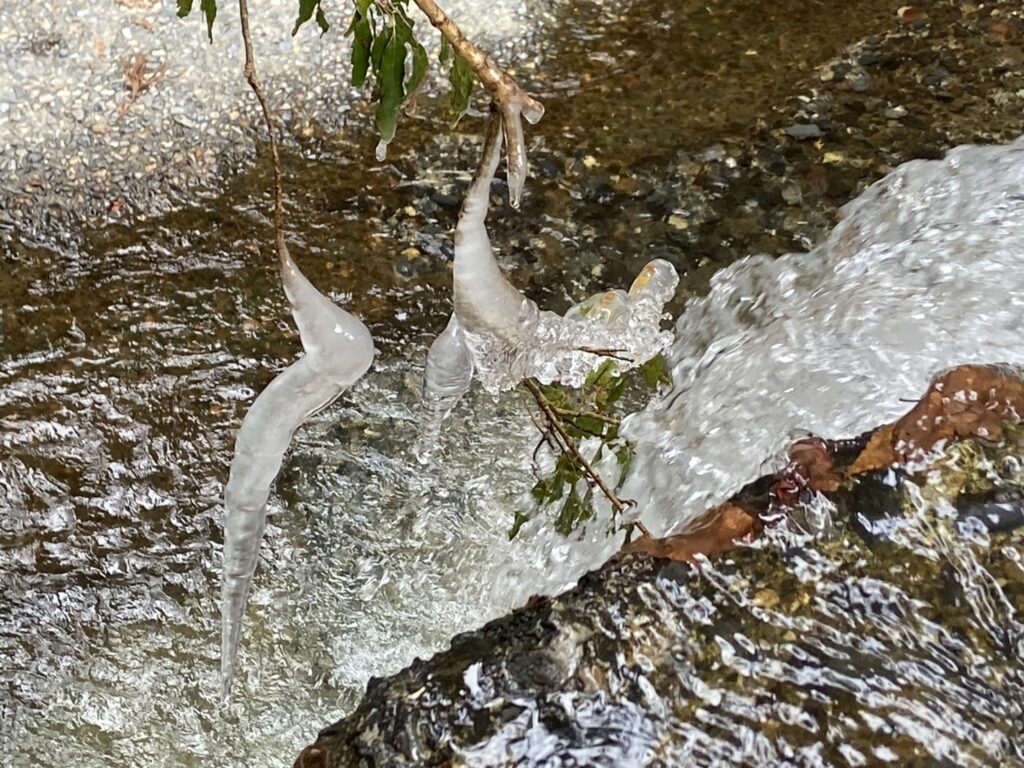 次のエン堤に移動すると木枝にビニールが引っ掛かっている⁈と思って近づくとツララでした。