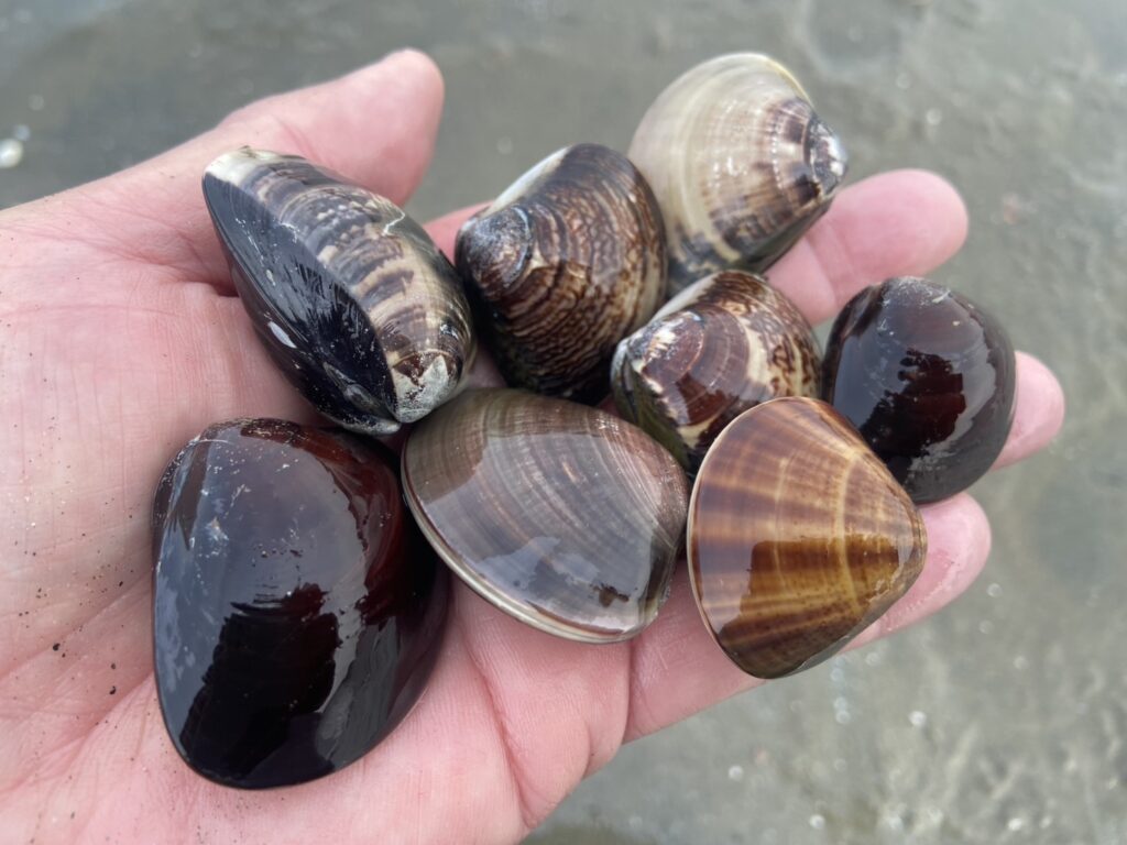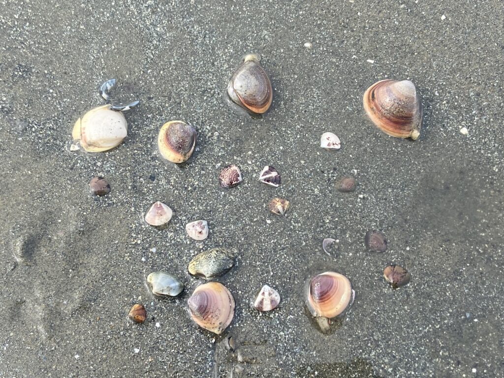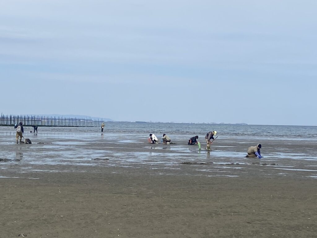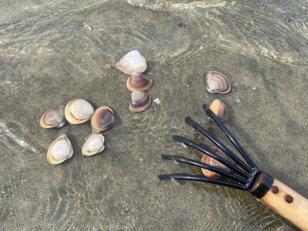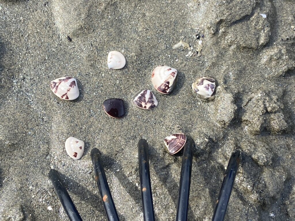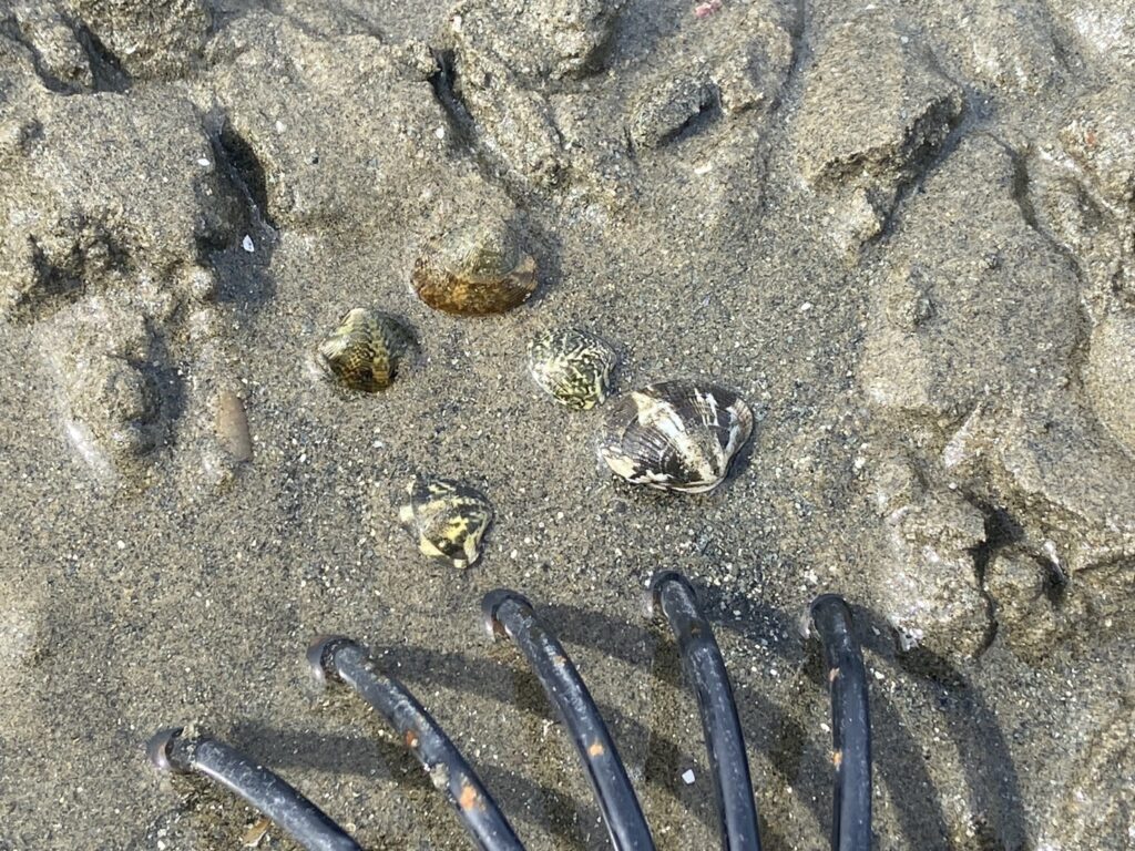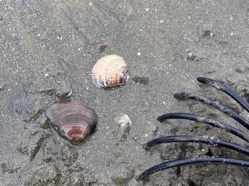 人の少ない潮の引いた先端の波打ち際でホリホリを開始するとハマグリやアサリそしてシオフキガイが出てきますがベビーサイズばかりです。