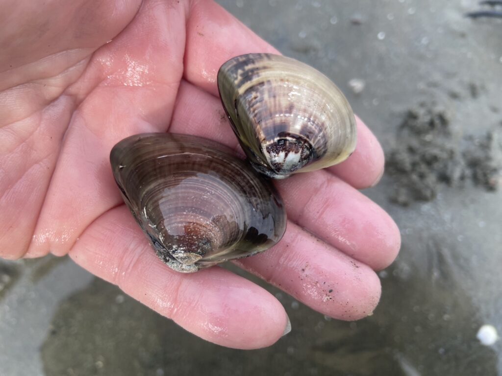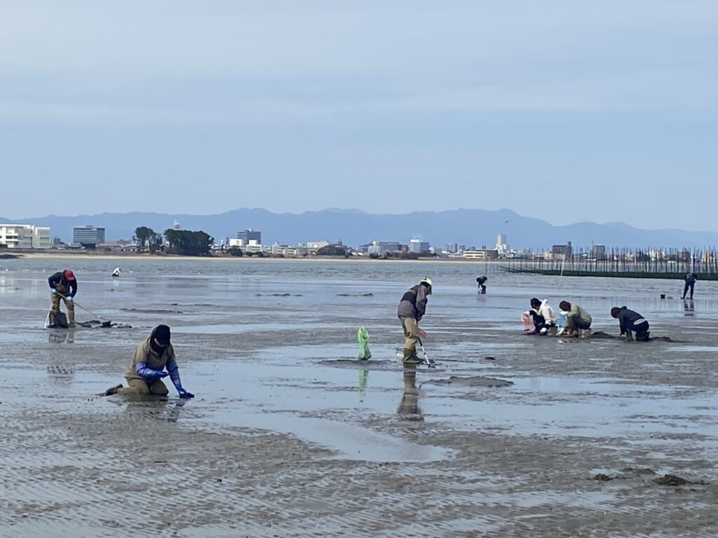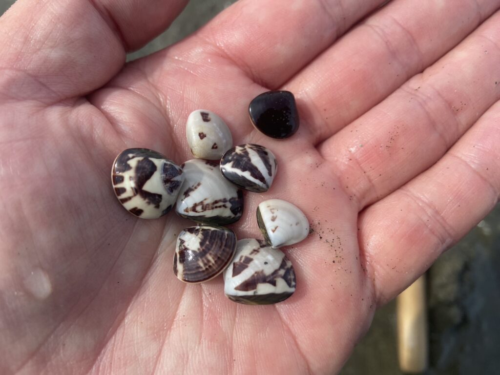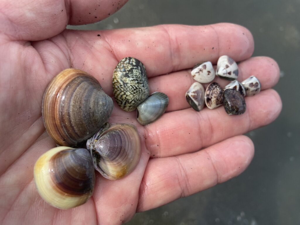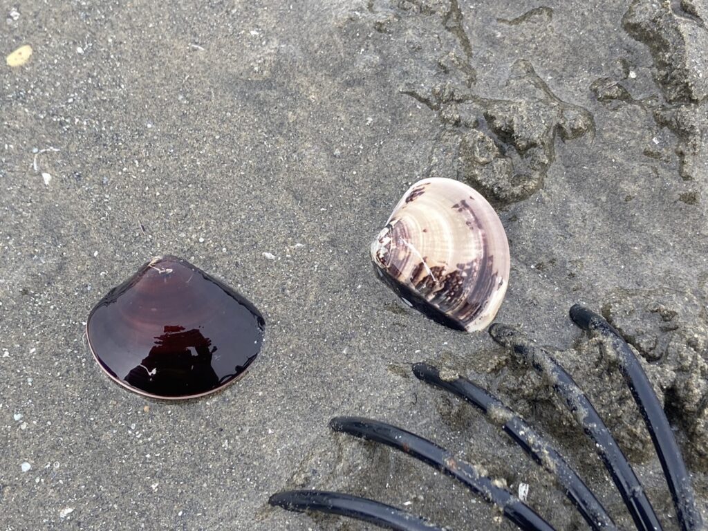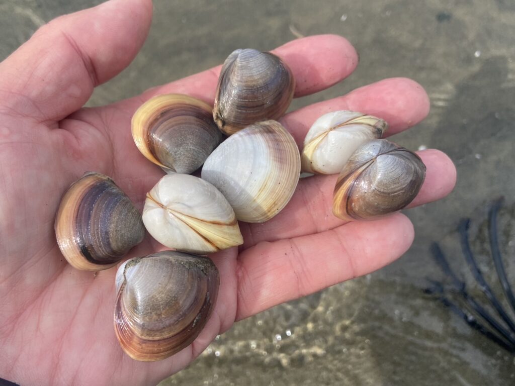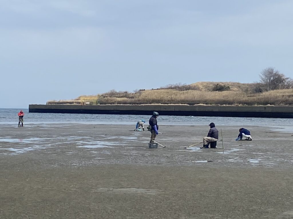人の少ない潮の引いた先端の波打ち際でホリホリを開始するとハマグリやアサリそしてシオフキガイが出てきますがベビーサイズばかりです。
