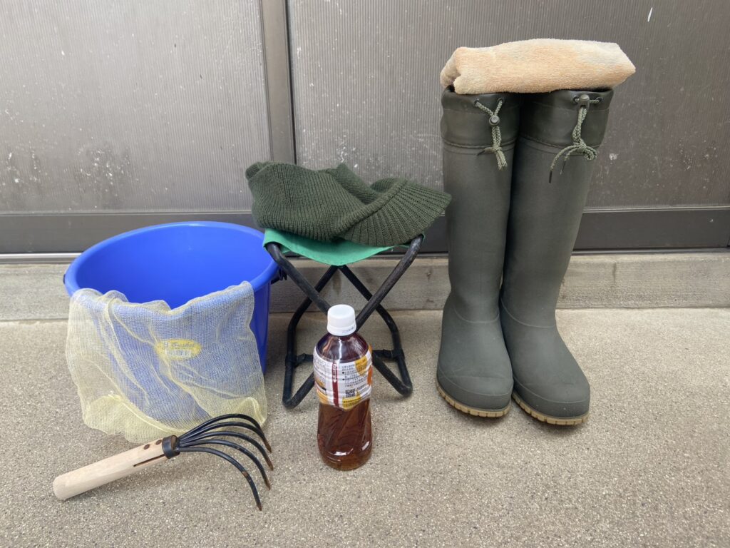 熊手、バケツ、網袋、長靴、帽子、パイプ椅子、タオル、飲み物など。
