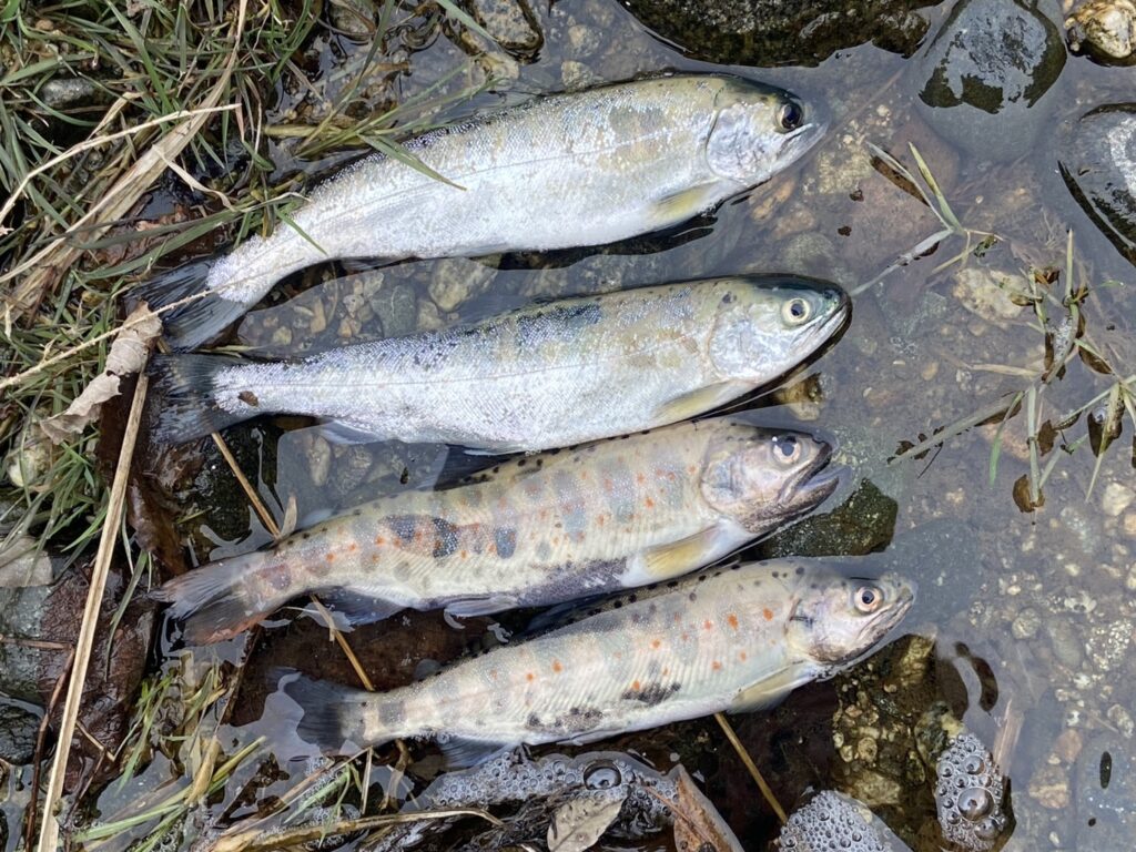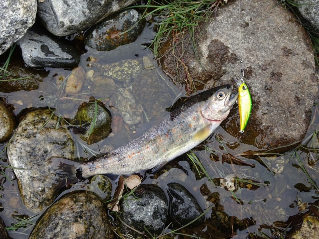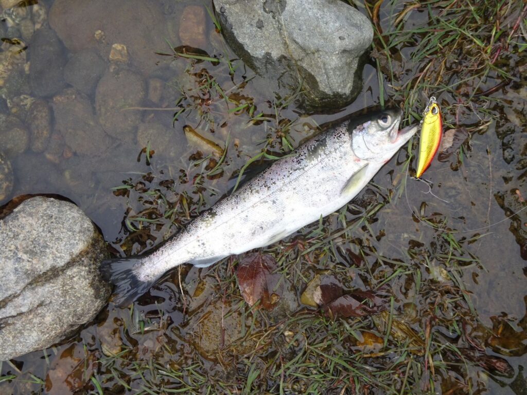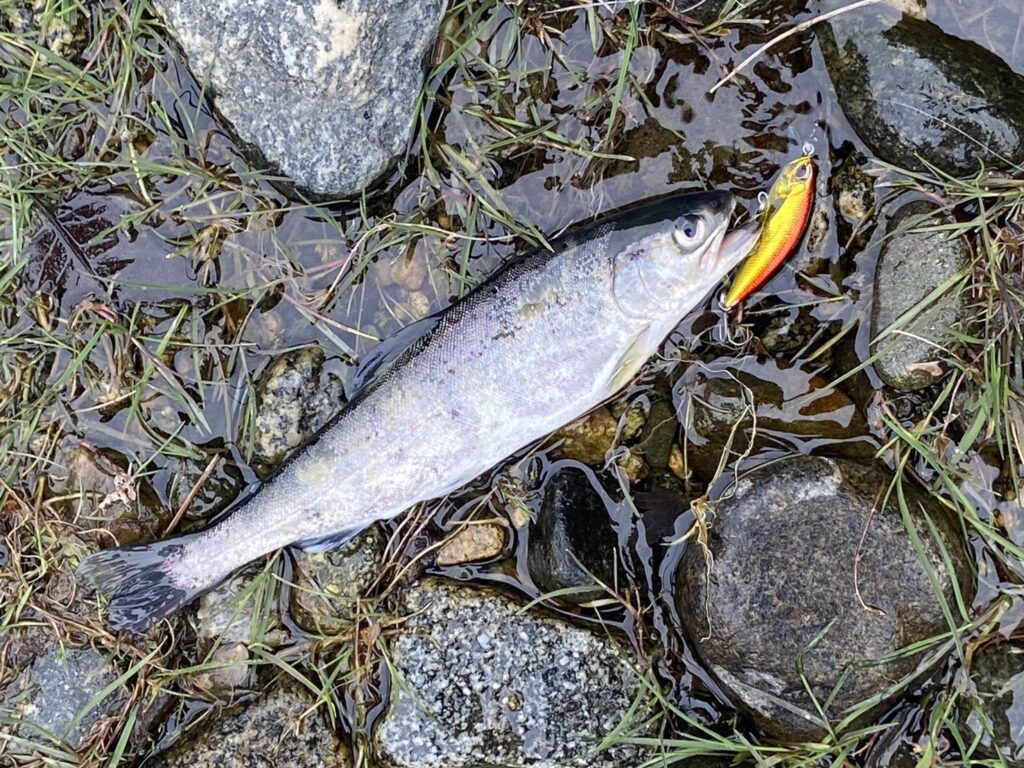 シンキングミノーで上流や下流へキャストしてただ巻きすると追いかけてきます。魚影が見えてワクワクドキドキです。しかし足元で反転していきます。