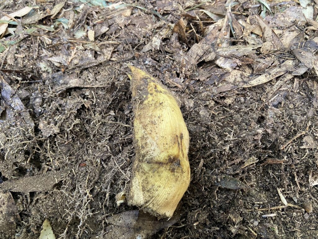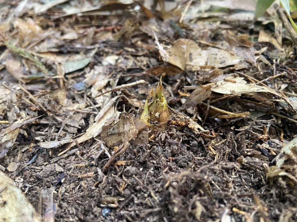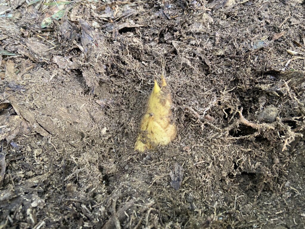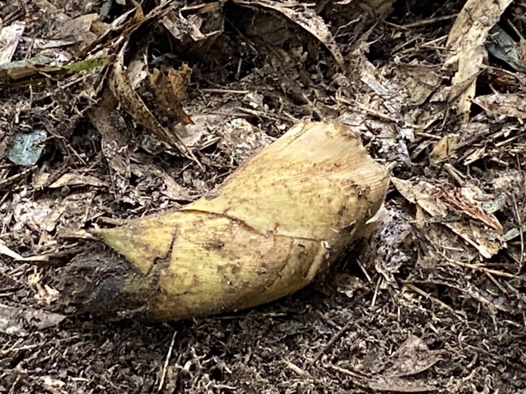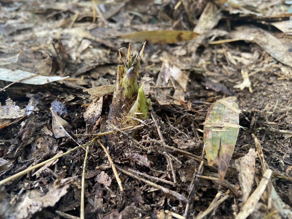 落ち葉が盛り上がった下にはタケノコが顔を出しています。