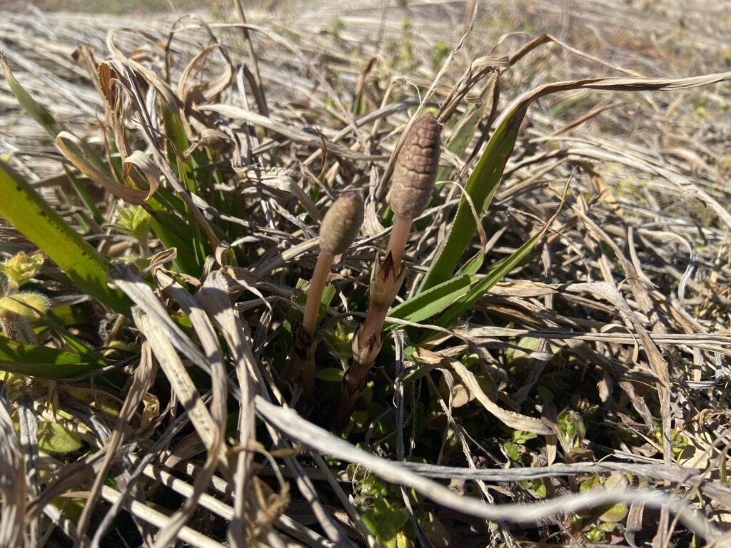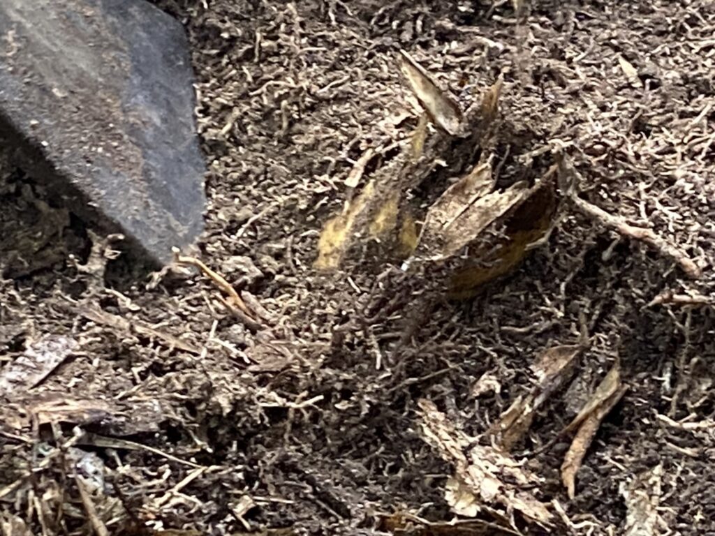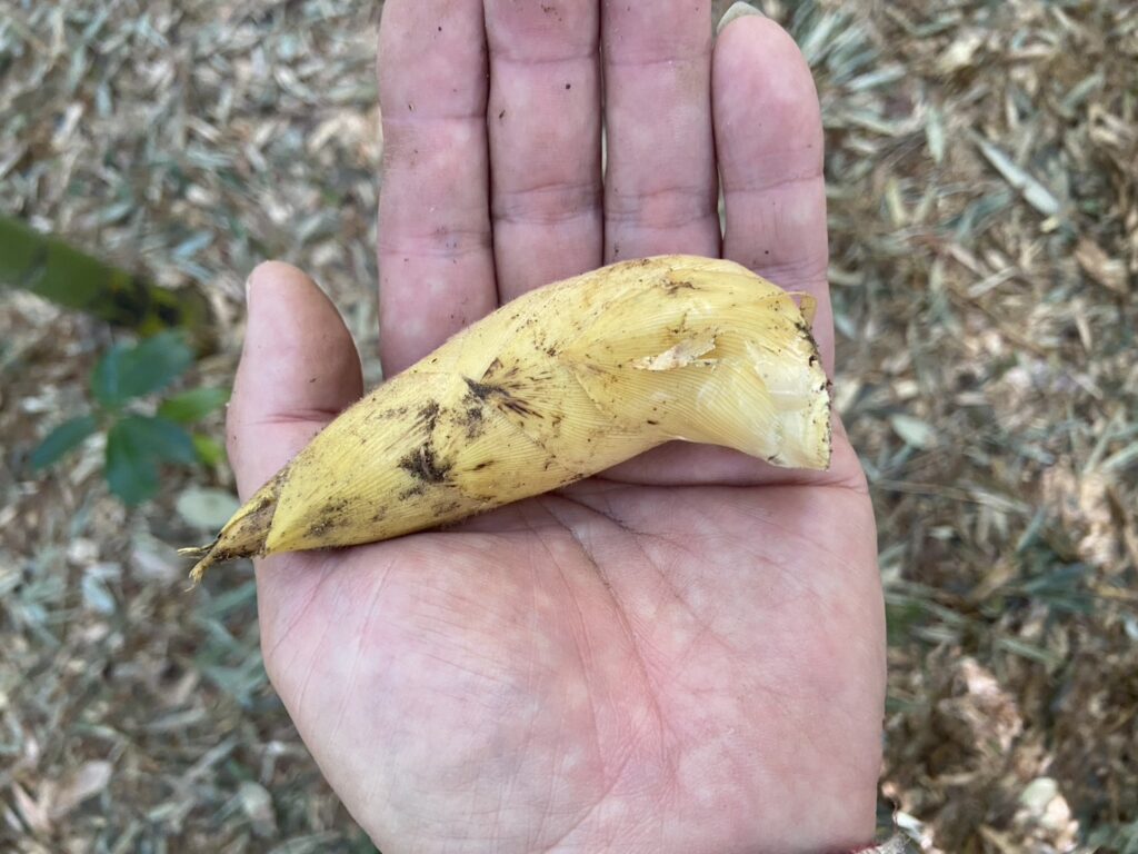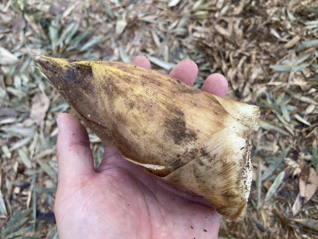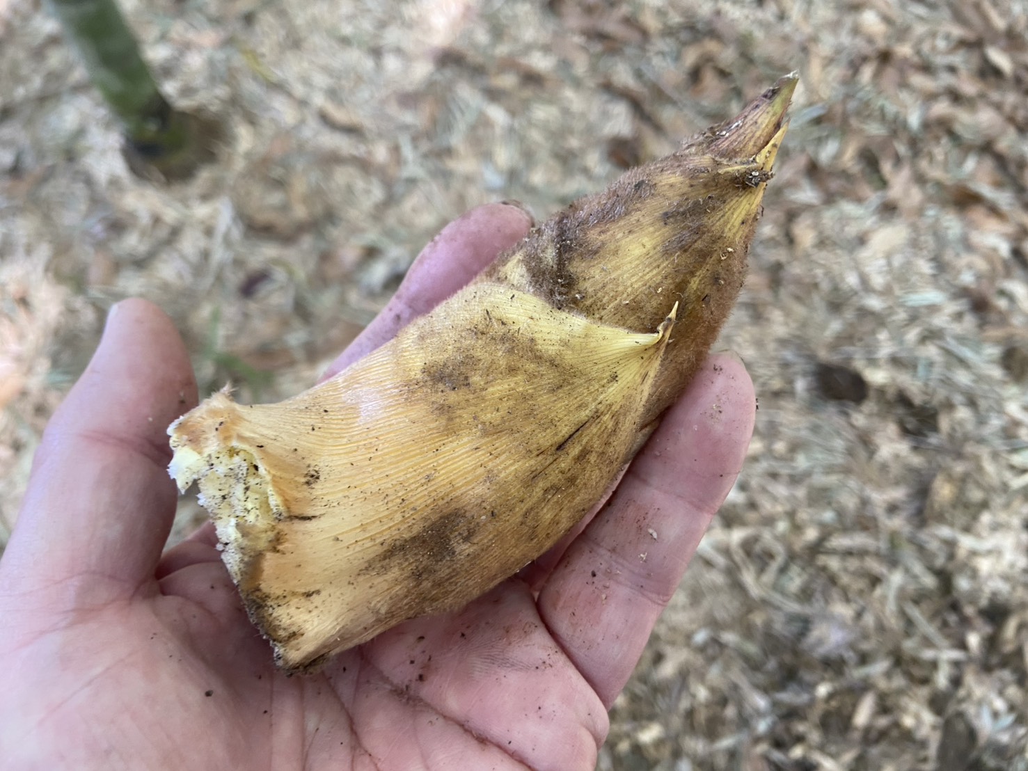 落ち葉が盛り上がった下にはタケノコが顔を出しています。