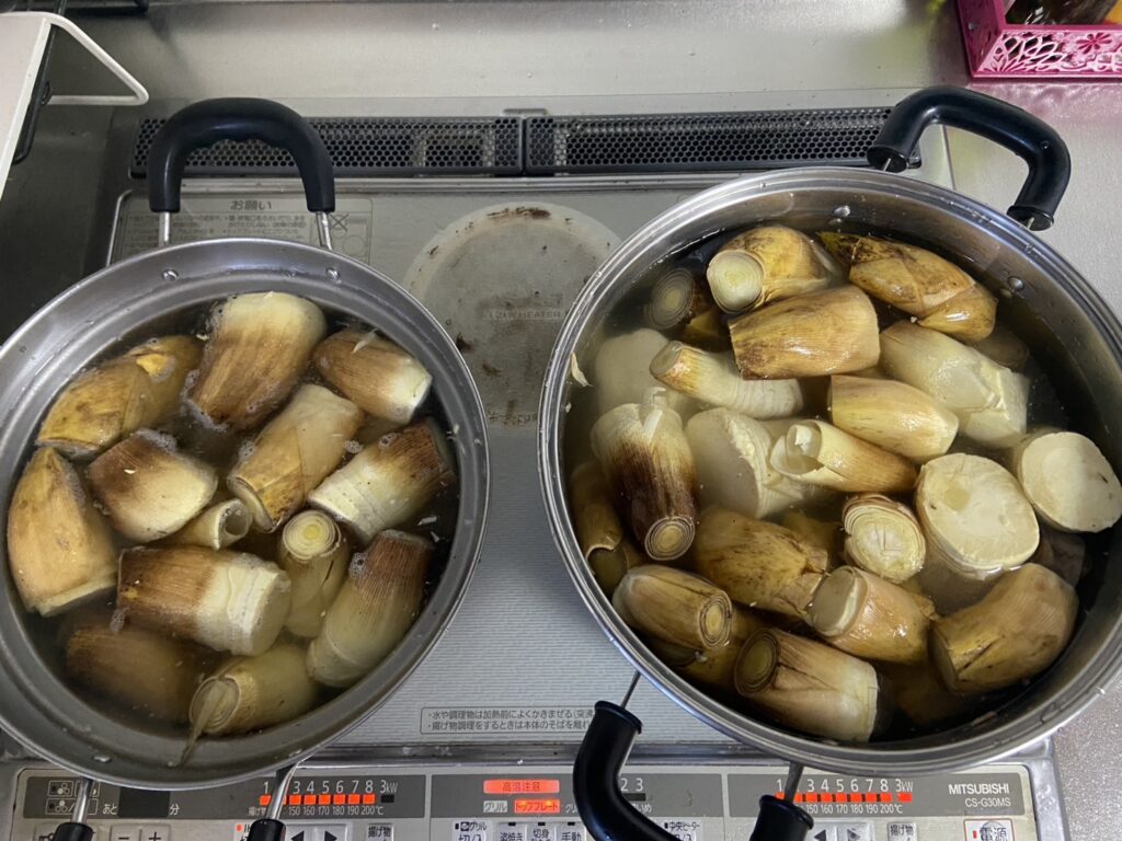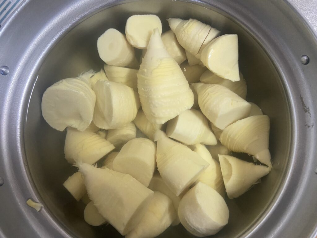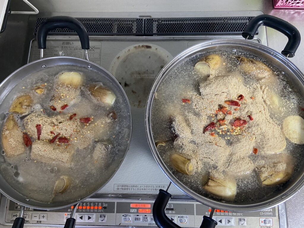 水、米ヌカ、赤唐辛子を入れて火にかけてアクを抜きます。