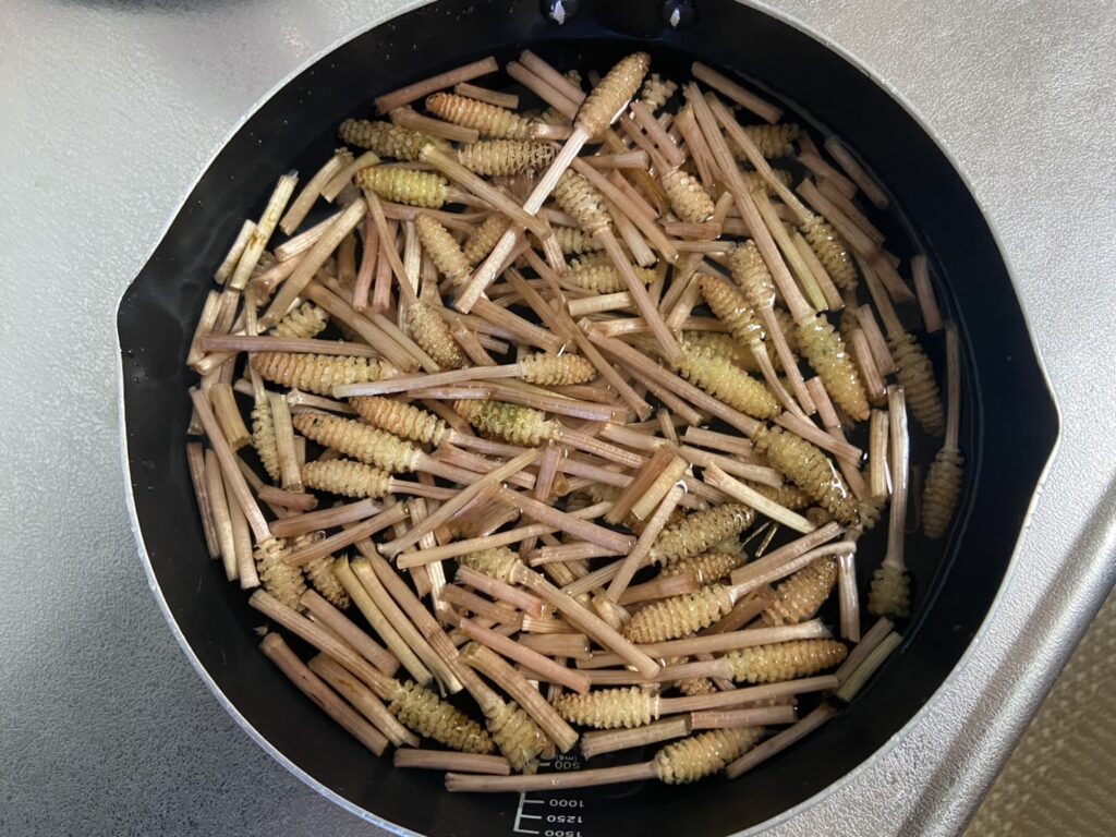 自宅でハカマを取ってから水にさらして汚れを落として鍋に塩や酢を少々加えてサッと茹でたらアク抜き完了です。