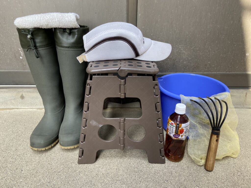 熊手、バケツ、網袋、長靴、帽子、折りたたみ椅子、タオル、飲み物など。