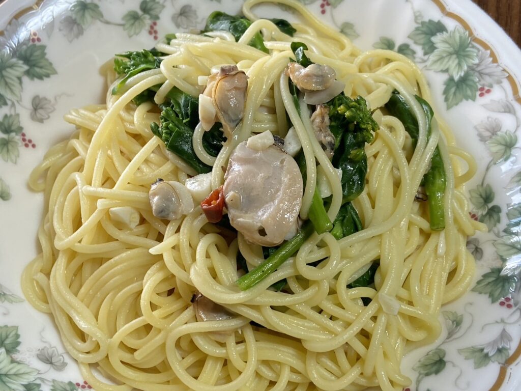 翌日の夕食はハマグリの酒蒸しとハマグリと菜花入りパスタをペロリ!
