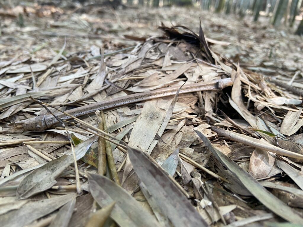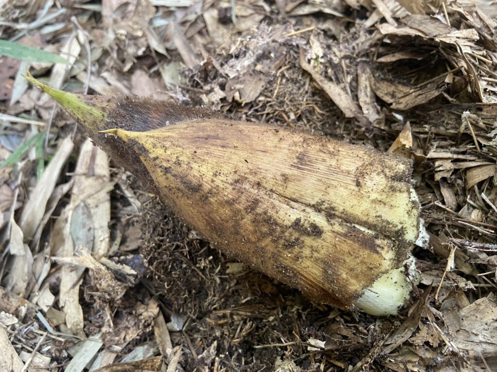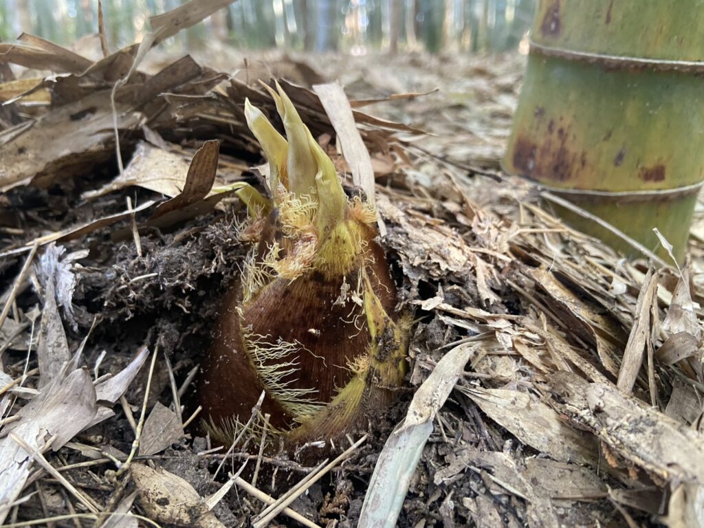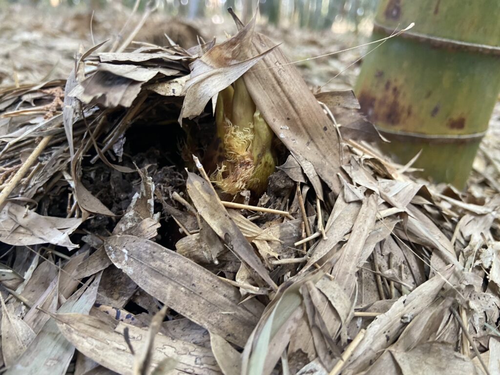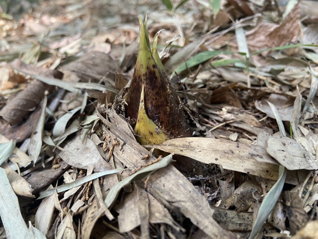 落ち葉を押しのけて頭を出しているタケノコもあります。