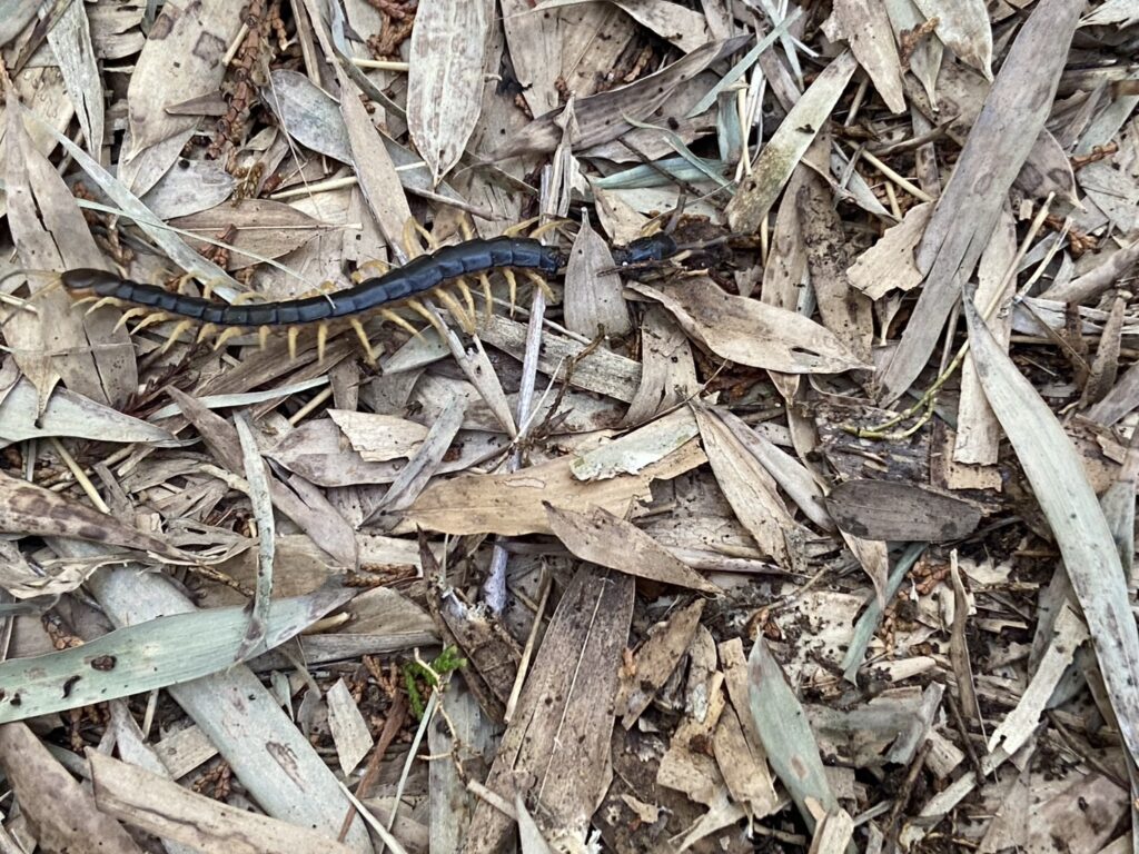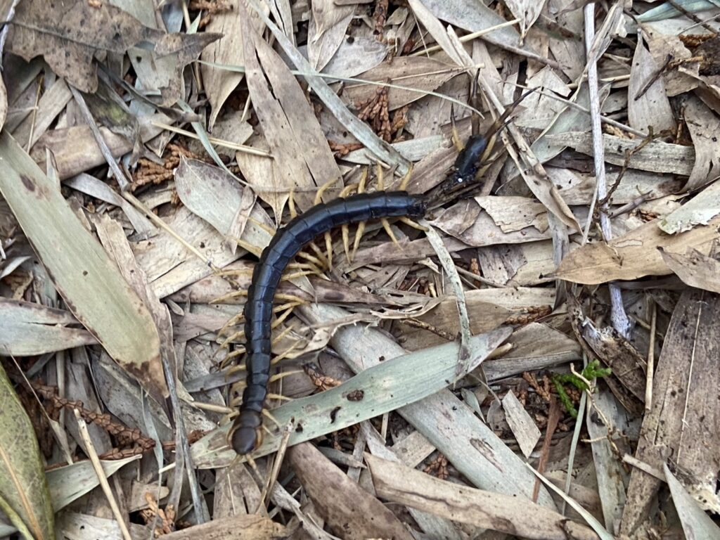 出たぁームカデです。たくさんの足を動かして逃げていくのを見送りました!!