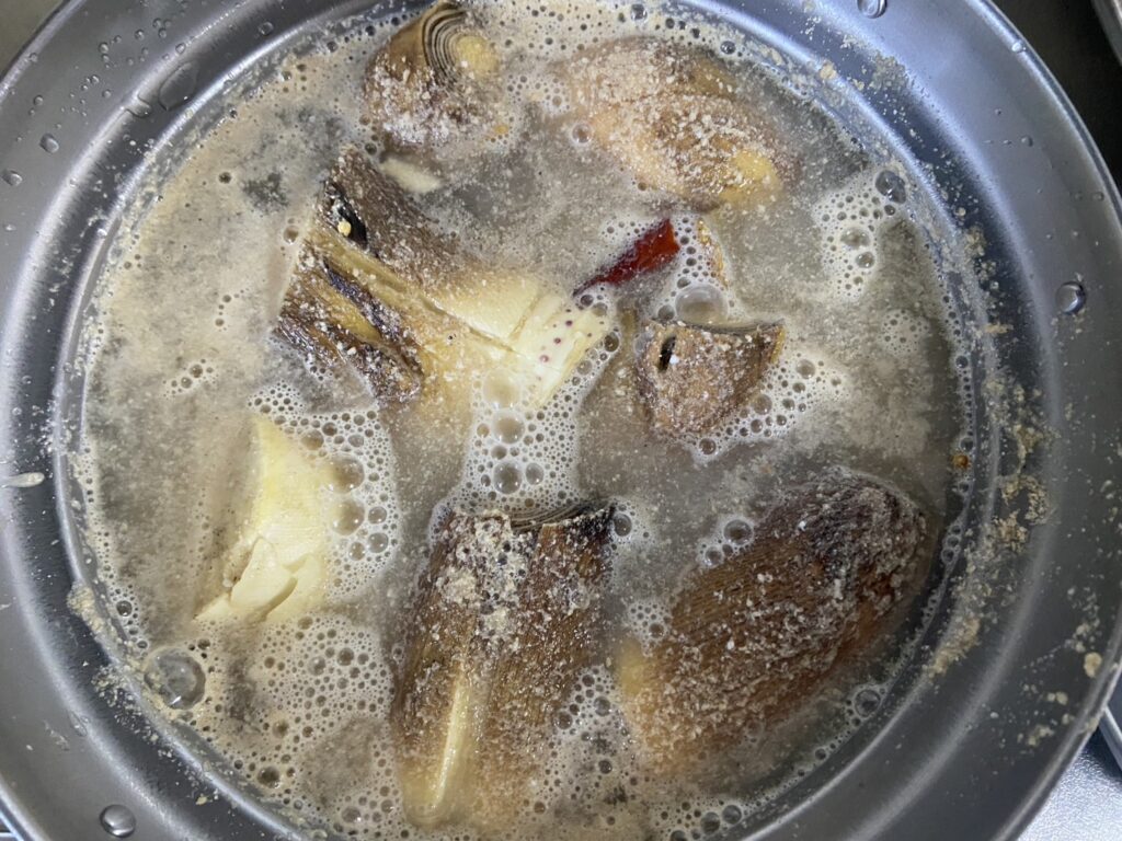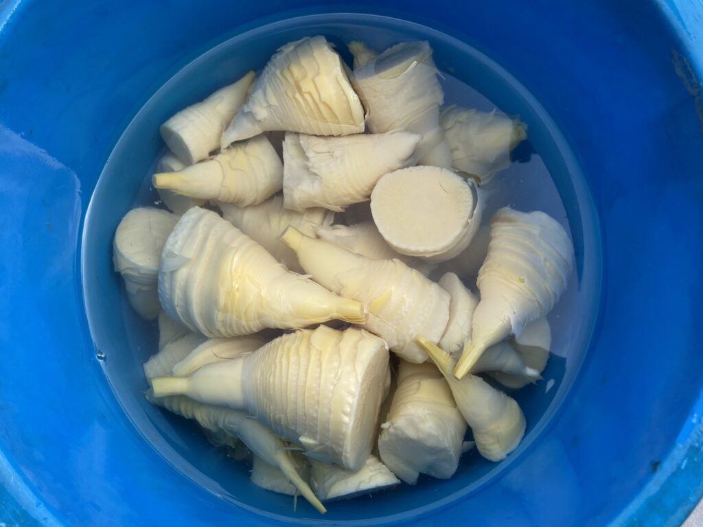 タケノコは上下をカットしてコメヌカと赤唐辛子を入れて茹でます。