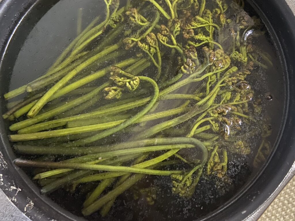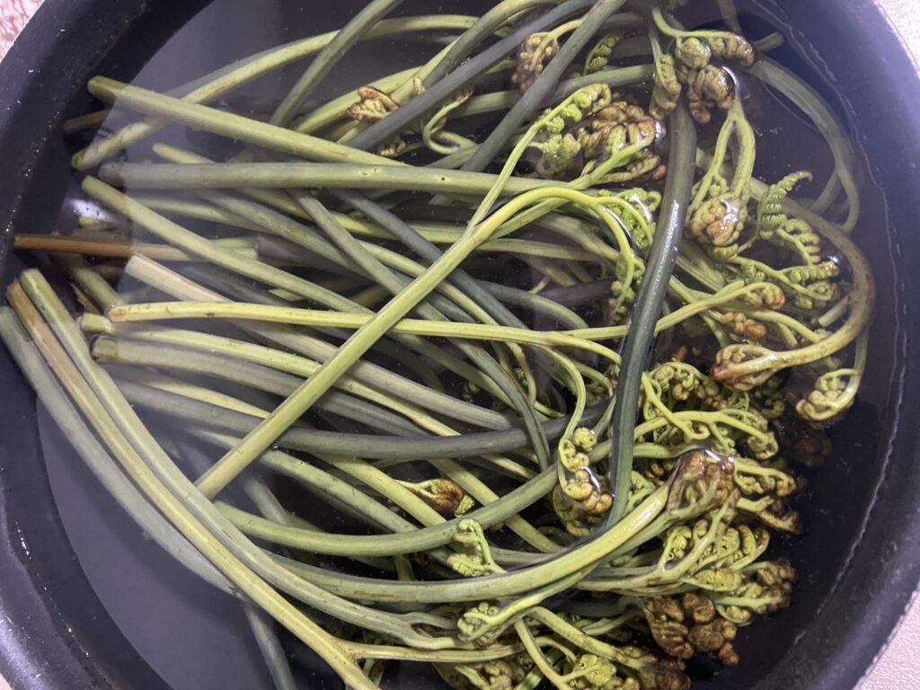 ワラビは熱湯に溶かした重曹液をかけて一晩おき、翌日水にさらします。