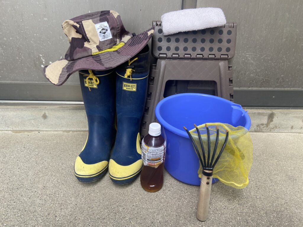 熊手、バケツ、網袋、長靴、帽子、折りたたみ椅子、タオル、飲み物など。