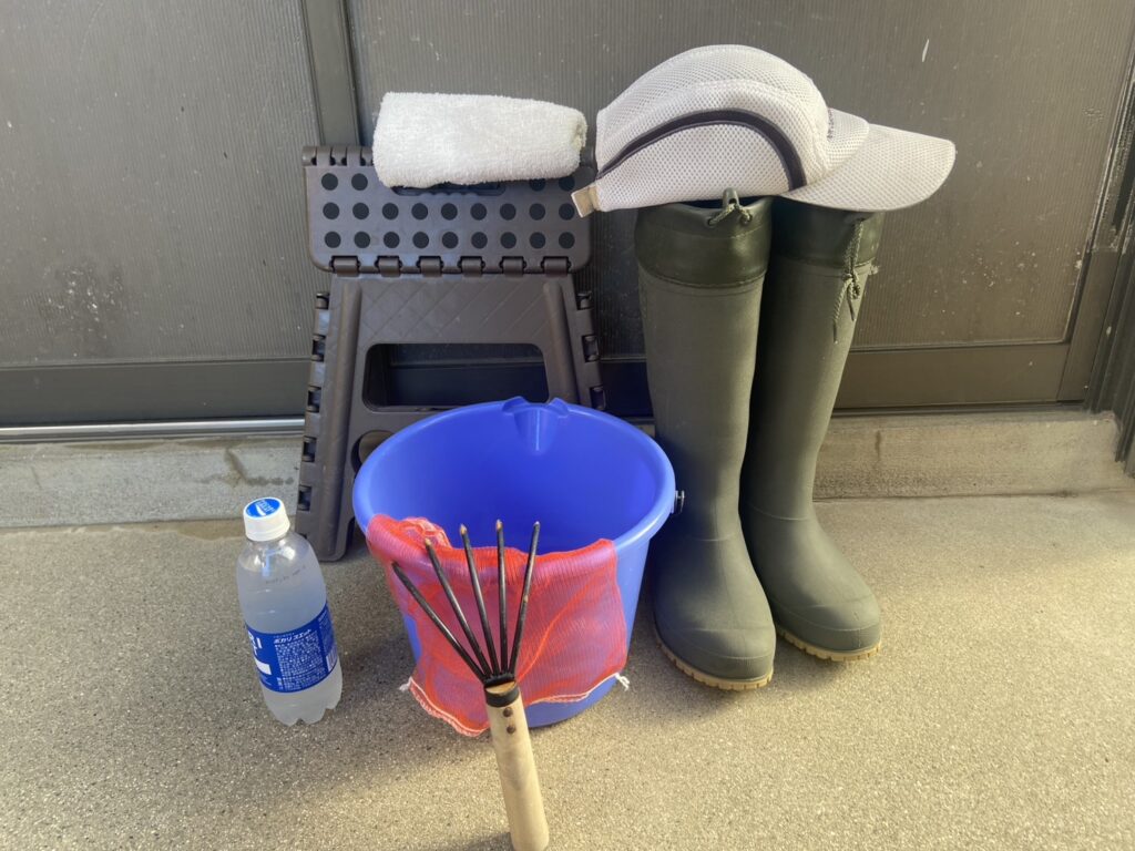 熊手、バケツ、網袋、長靴、帽子、折りたたみ椅子、タオル、飲み物など。