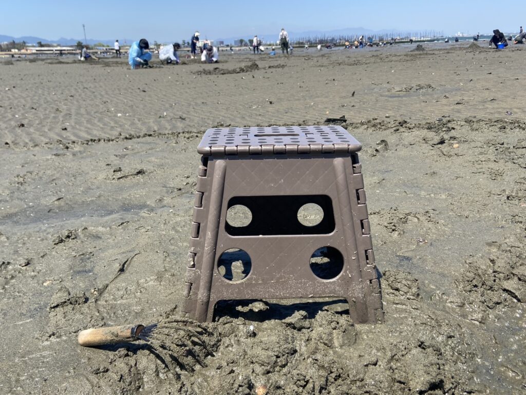 ウェダーを着てヒザをついたり座ったりして掘り掘りしている人もいますが暑くて蒸れるので長靴で折りたたみ椅子に座って掘り掘りするのが一番です。