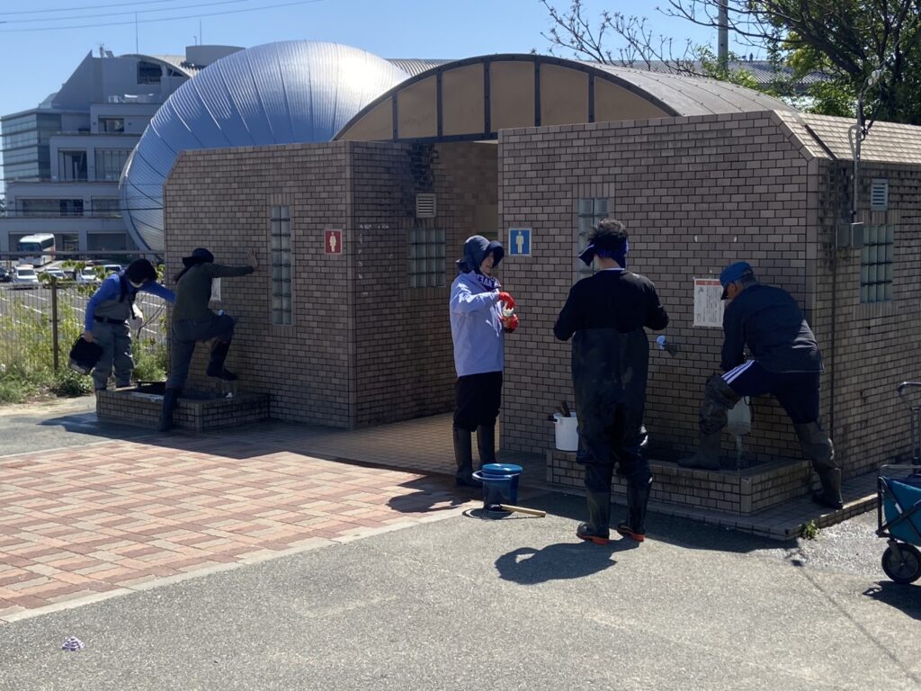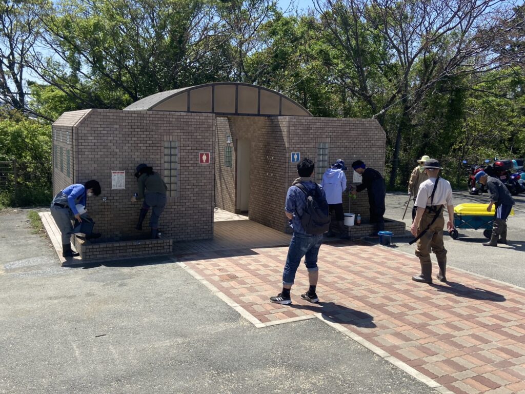 護岸道路にあるトイレ横の洗い場は混雑していました。